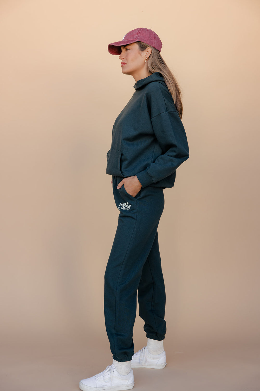 A matching forest green sweat set featuring a relaxed-fit hoodie and drawstring joggers for a cozy, laid-back look.