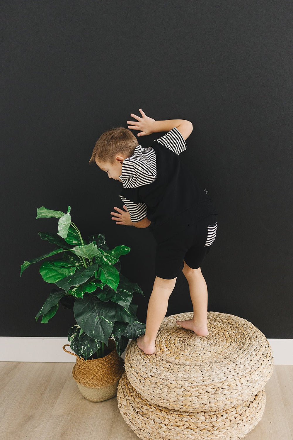 Get your little one ready for spring with the Harrison Set. This comfy short sleeve hoodie set features a striped hood, sleeves, and back pocket, adding the perfect pop of style to this outfit. Made with a lighter weight sweatshirt material, it's perfect for cool weather and is extremely comfortable.