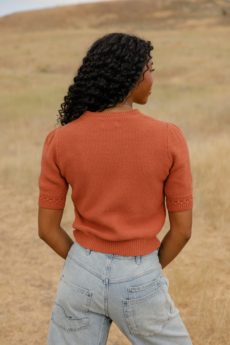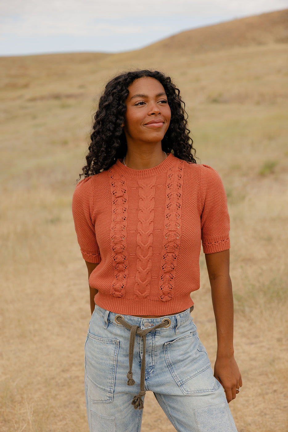 A cropped cable knit sweater in warm rust with short sleeves—cozy enough for chilly mornings, cute enough for all-day wear.