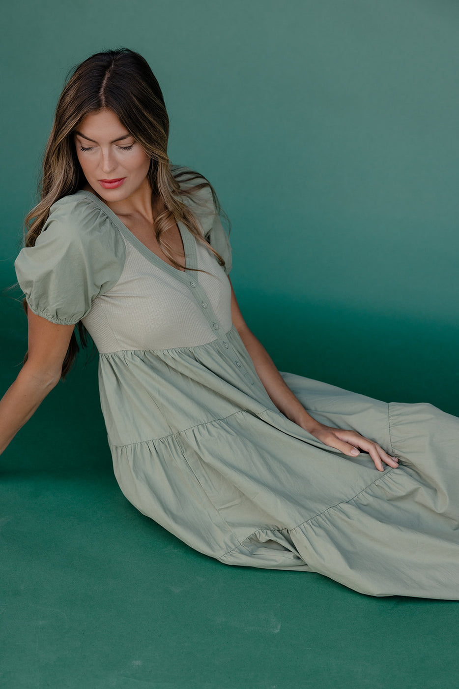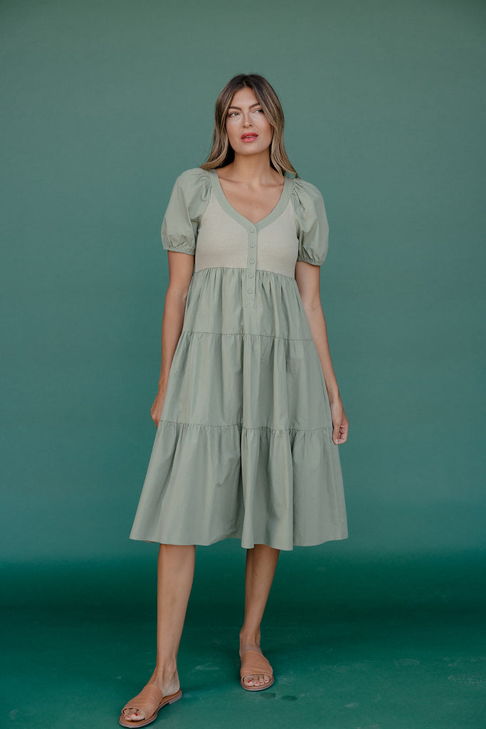 This sage green dress blends soft textures and playful structure with its ribbed knit bodice, button-front detail, and crisp cotton poplin skirt. Featuring puff sleeves and a tiered silhouette, it’s equal parts comfy and polished—perfect for breezy days and casual outings.