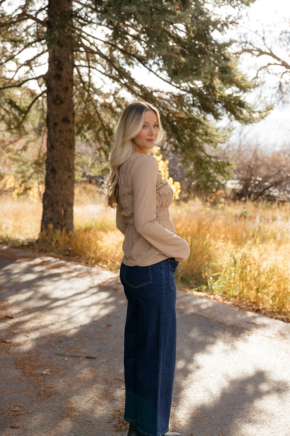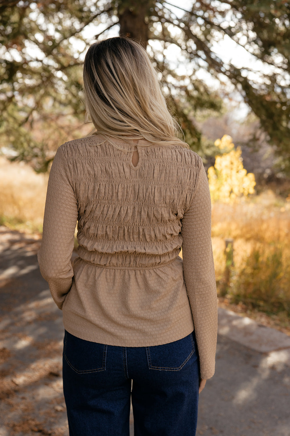 Feminine texture meets everyday ease. The Honeycomb Smocked Blouse features delicate ruching, a stretchy comfortable fit, and a soft neutral tone that styles beautifully with denim or dressy trousers. A flattering piece that takes you from coffee runs to date nights.