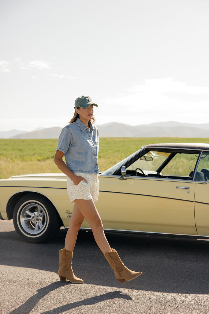 Meet your new favorite classic — the Howdy Denim Button Down Blouse is the perfect blend of Western charm and everyday cool. Made from soft, light-wash denim, this short sleeve button-down features a relaxed, boxy fit, a front chest pocket, and vintage-inspired stitching. Whether you're pairing it with matching denim or throwing it over a sundress, it's the versatile piece your wardrobe's been waiting for.