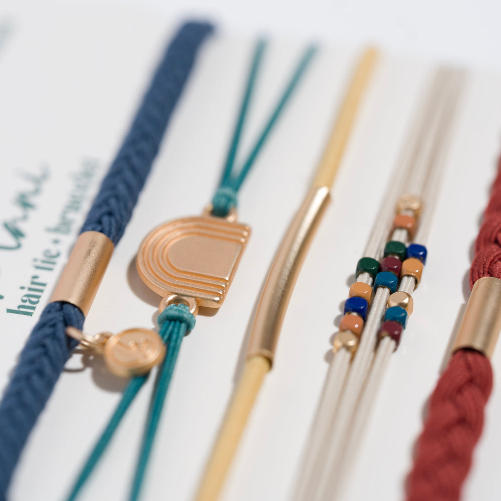 Our IMAGINE set includes 5 hair tie bracelets in sun-kissed rainbow hues: blue, green, yellow, and red and is complemented by a stunning cream bracelet with multicolored beads. The golden rainbow charm brings hope of the beautiful possibilities that come after rain.