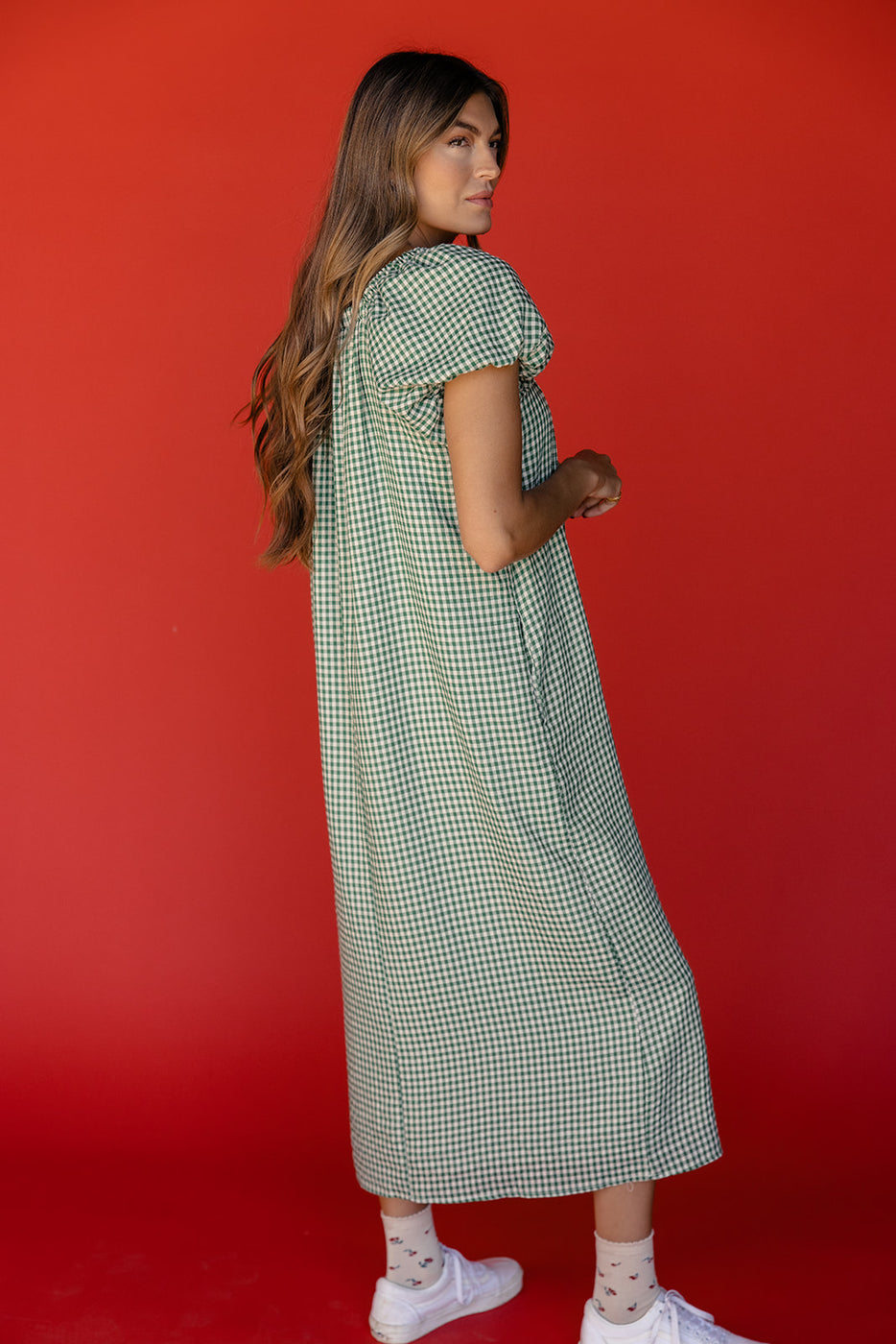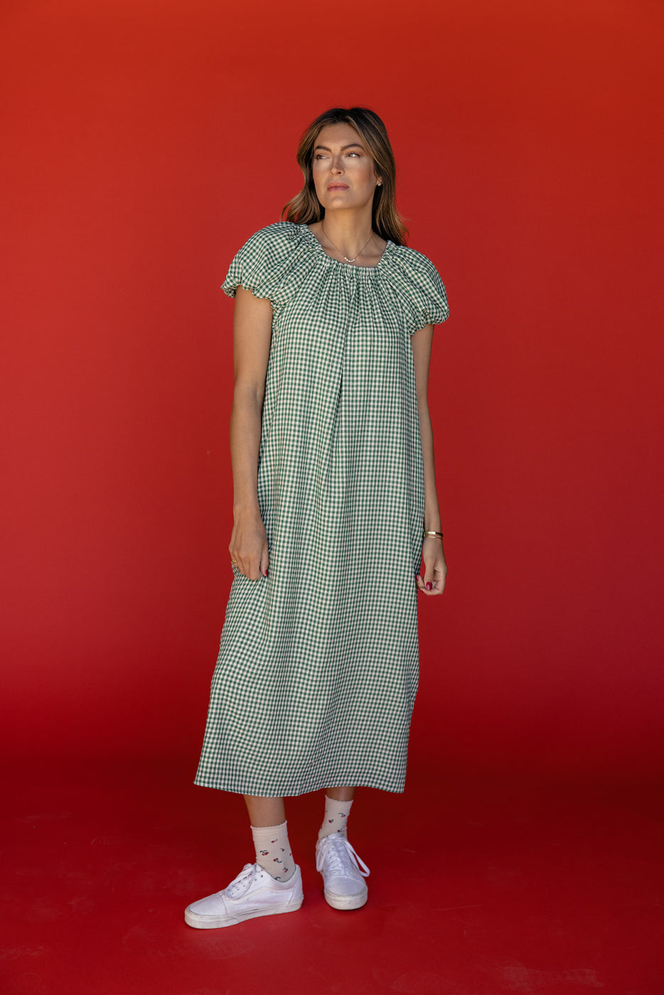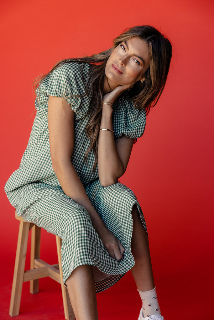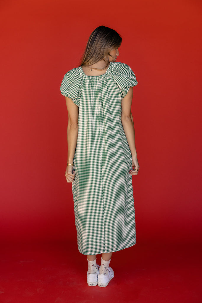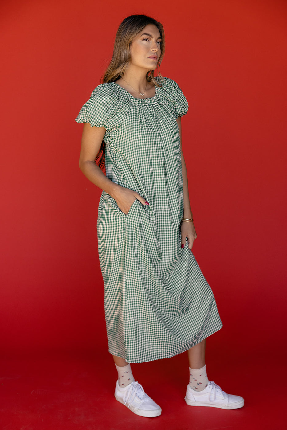 Meet your new go-to for effortless charm — this green gingham dress features a relaxed, flowy silhouette with a gathered neckline and short puff sleeves. Its midi length and subtle side pockets make it both practical and playful. Perfect for sunny strolls and casual days out. 💚