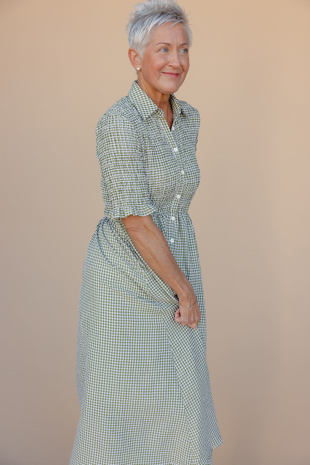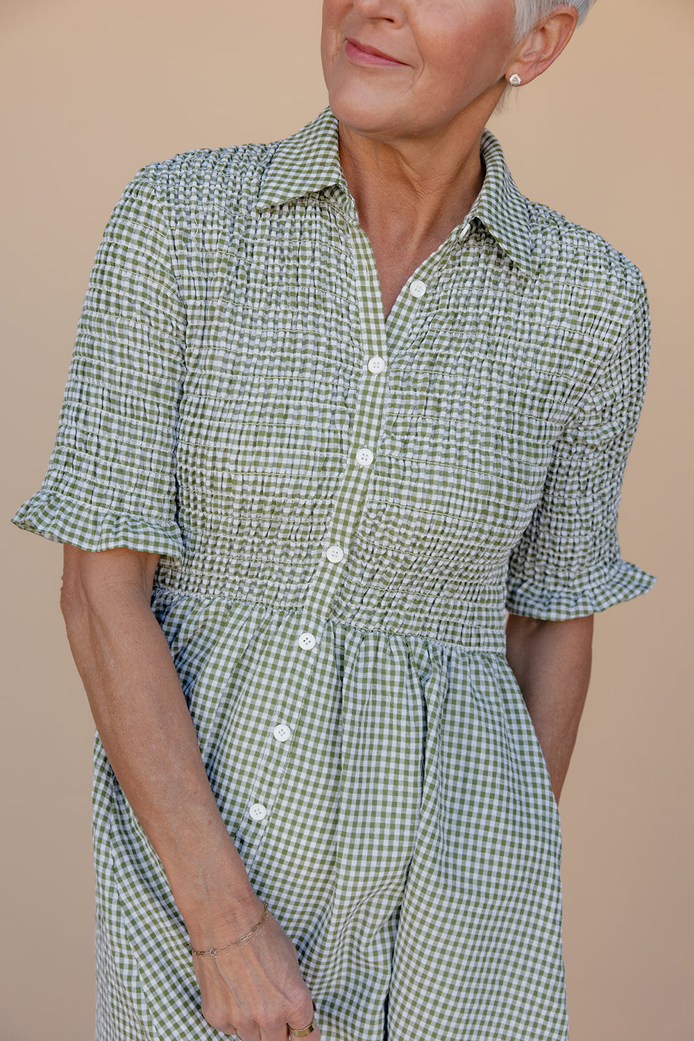A little academic, a lot adorable. This brown gingham dress features a smocked bodice, collared neckline, and full front buttons.