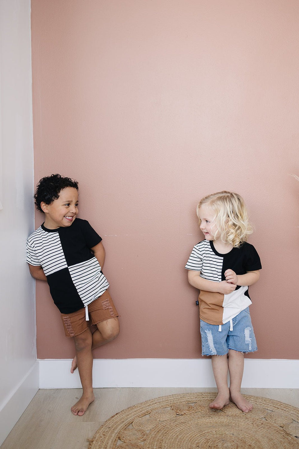 Your little one is going to love our Jackson Shorts. Made from a soft and stretchy material, they are way more comfortable than your typical denim shorts. The raw hem at the bottom and rips in the front add style while the functional drawstring adds comfort.