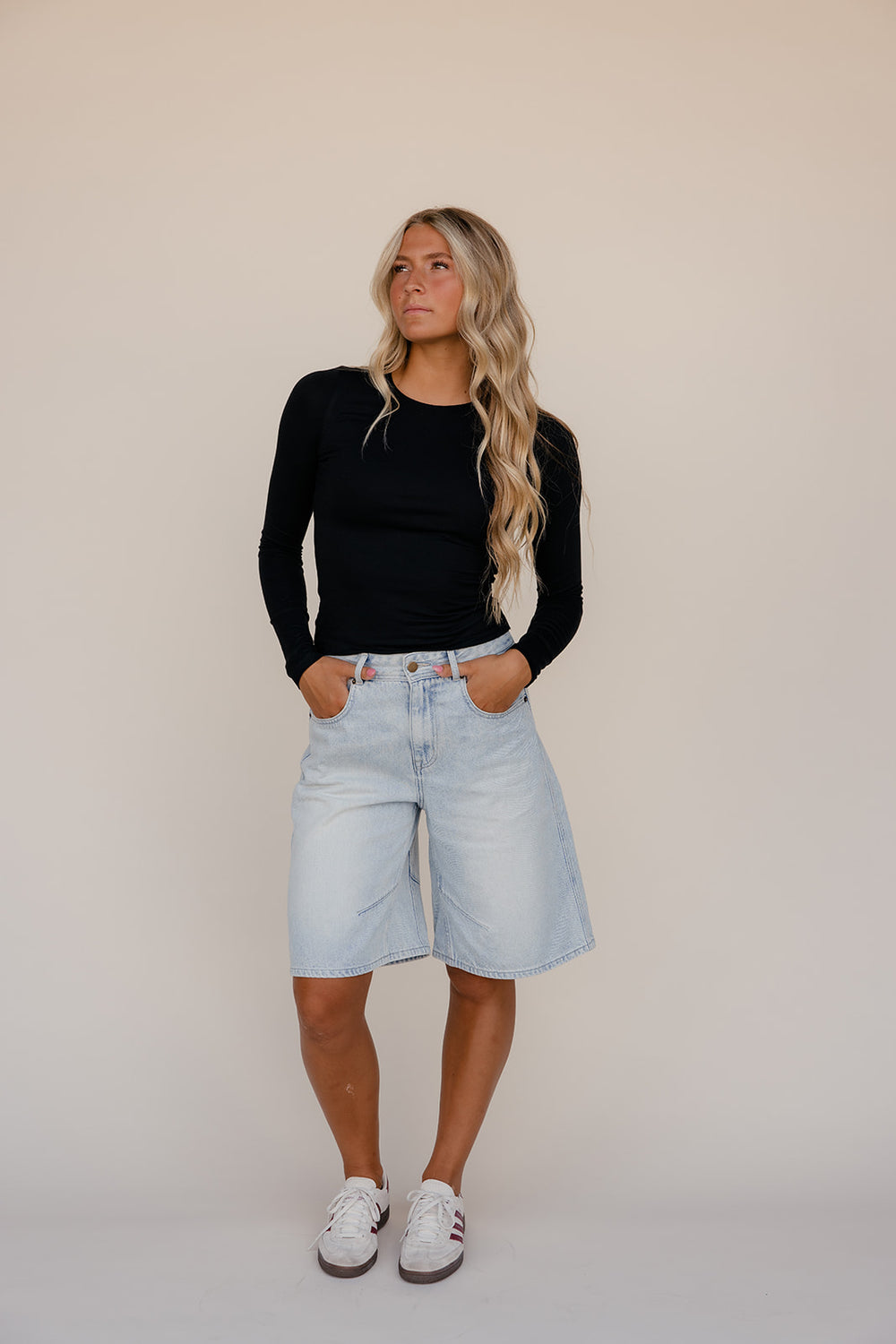 Light wash wide-leg denim Bermuda shorts with a high-rise fit, raw hem, and vintage-inspired fade. Easy, breezy, and perfect for summer.