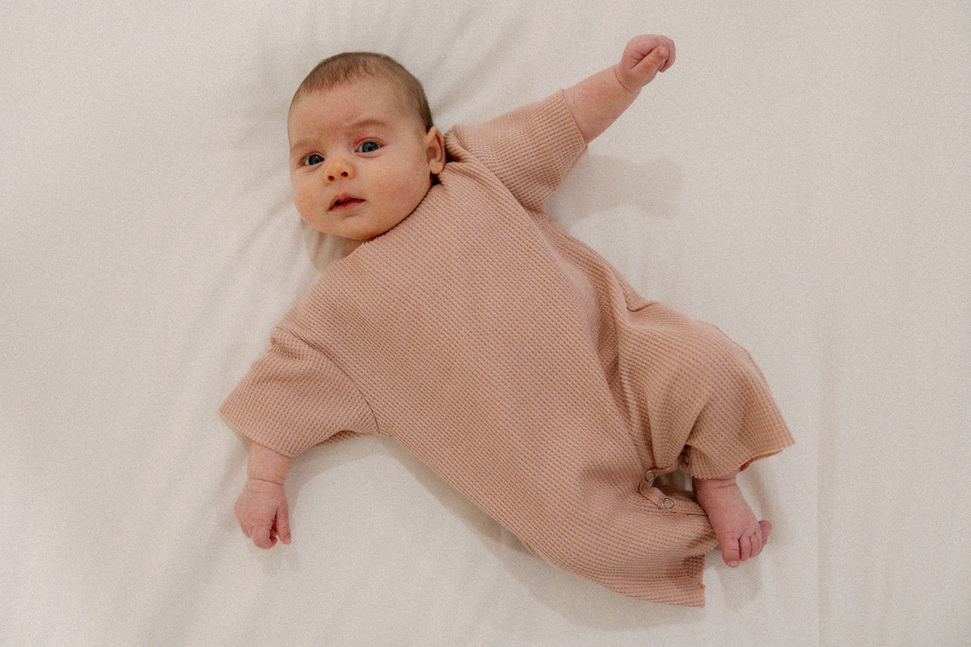 Get ready for a comfortable and cute outfit for your little one with the Jo Romper. Made with soft waffle knit fabric, this romper offers a loose fit and features snap openings for easy changes. Perfect for both baby and toddler boys and girls, with a raw hem for added style.