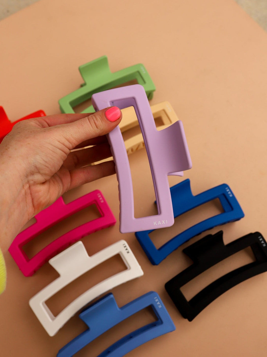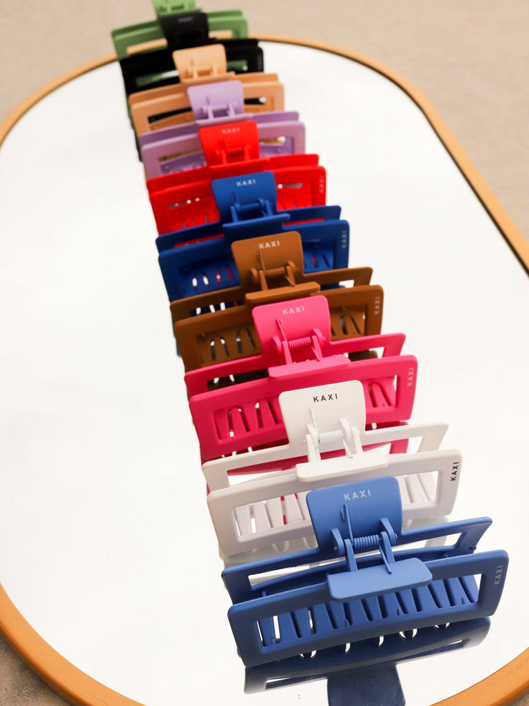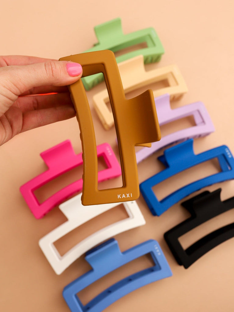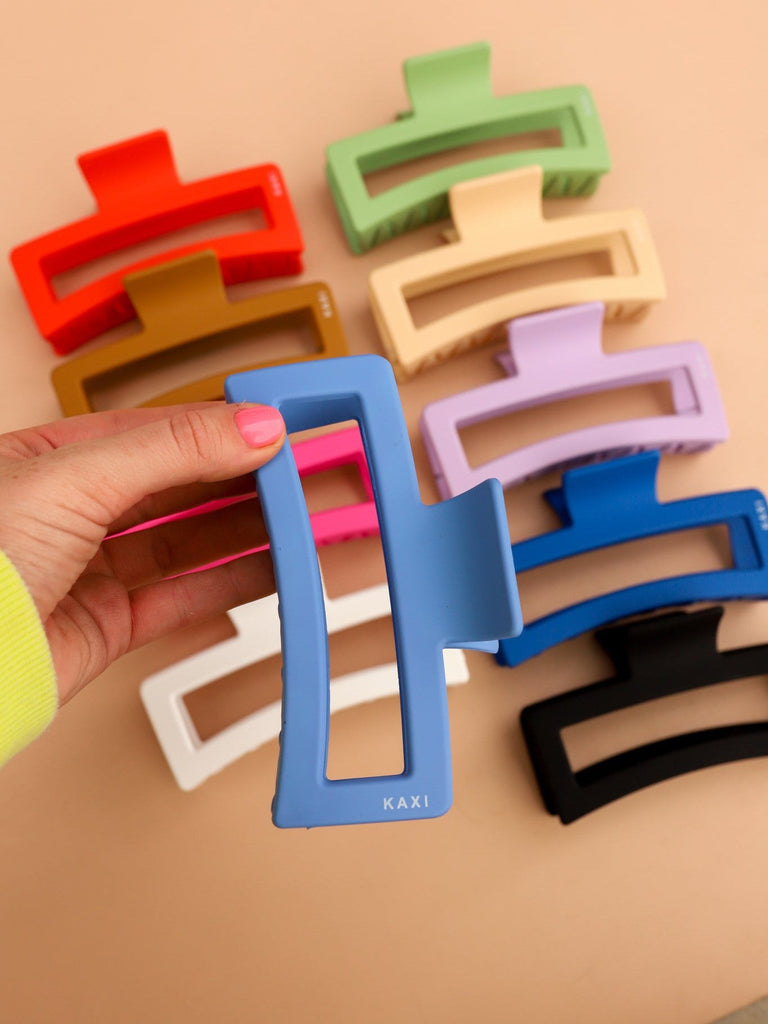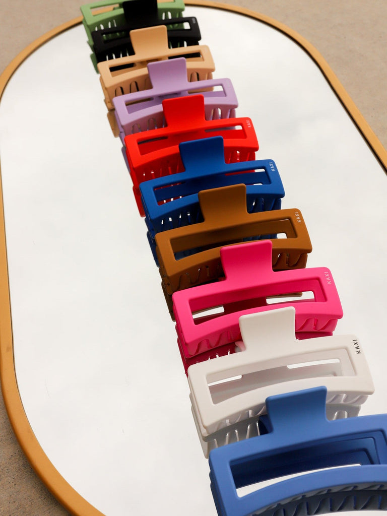 These are so fun and SO oversized!! These strong 5 inch rectangle claws come in the most beautiful matte colors!! Because these are so oversized, they can hold large amounts of hair making these the perfect claws for our girls with thick hair. We love the size + shape of these guys! These are also customized with our very own KAXI logo!