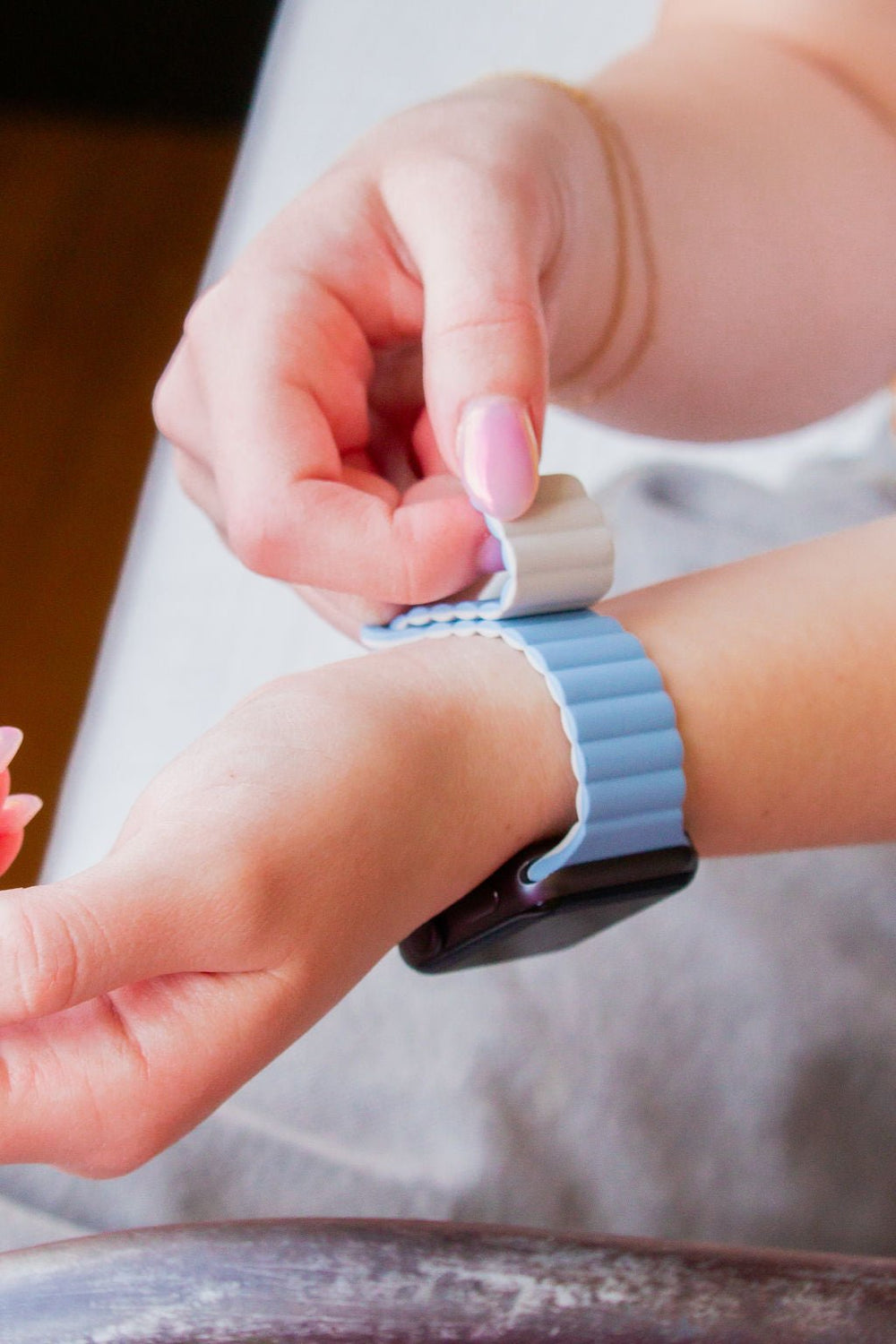 These new magnetic watch bands are made for all your apple watch needs! This watch band comes in one size and It features a strong magnetic silicone band, with a loop allowing the size to be adjusted exactly to your preference. This band will comfortably fit wrist sizes: 5.2 inches-7.25 inches (roughly XS-L andi sizing)