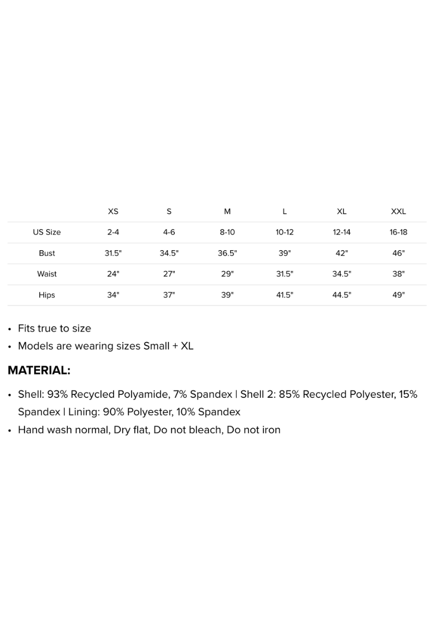 Shell: 93% Recycled Polyamide, 7% Spandex | Shell 2: 85% Recycled Polyester, 15% Spandex | Lining: 90% Polyester, 10% Spandex