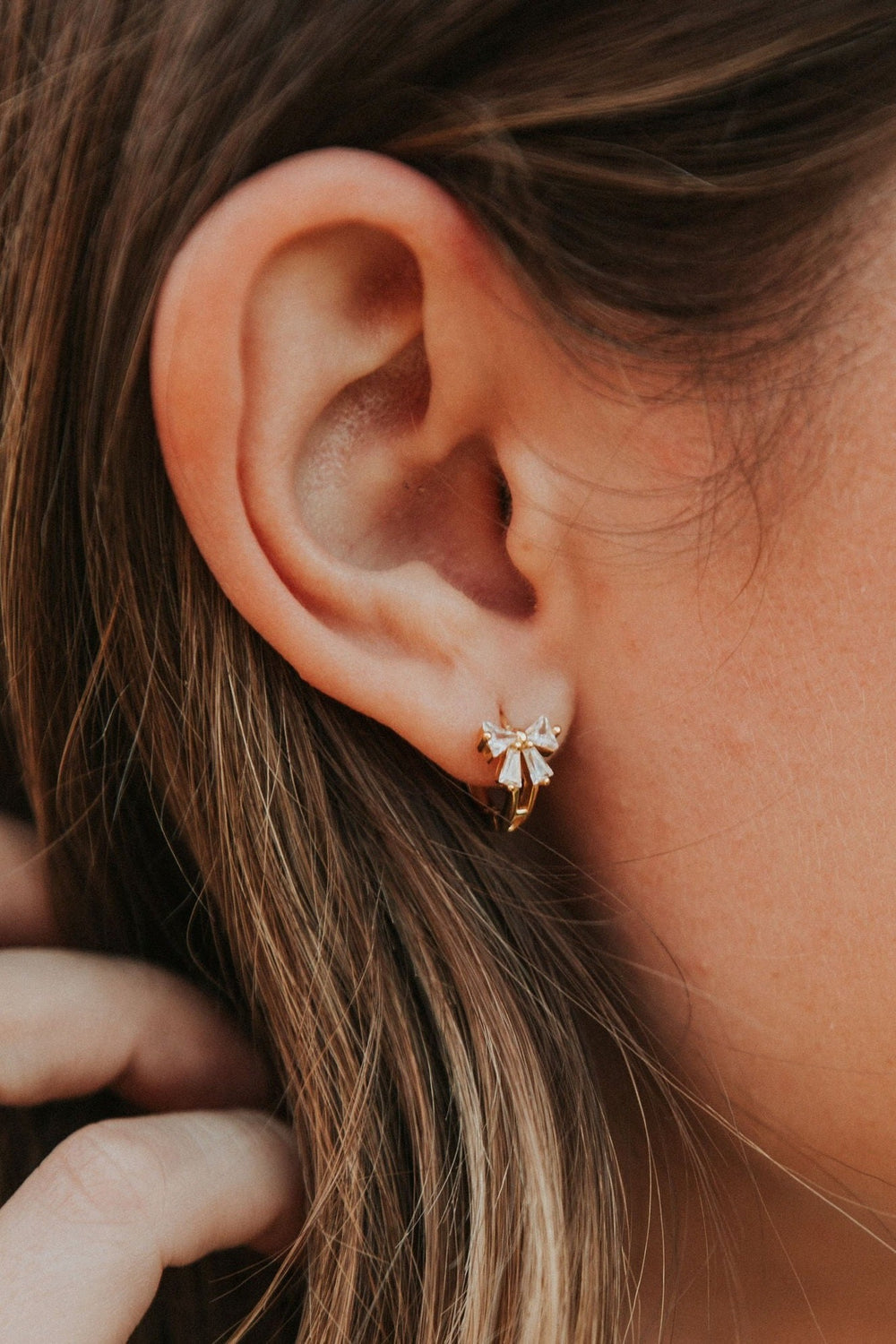 These Lucy Diamond Bow Hoops are the perfect accessory to complete any outfit. They are sterling silver based gold vermeil and are hypoallergenic, tarnish and wear resistant, and perfect for sensitive ears. They measure a dainty 10mm and are perfect for a first piercing or in an earring stack.