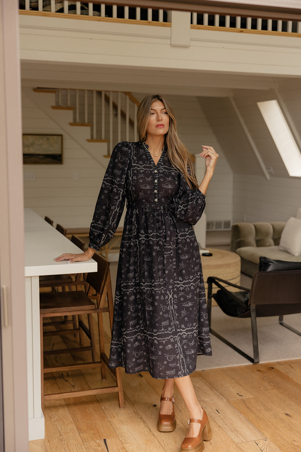Effortless and flattering. With its button-bodice design, waist tie, and black printed fabric, this dress transitions seamlessly from day to night.