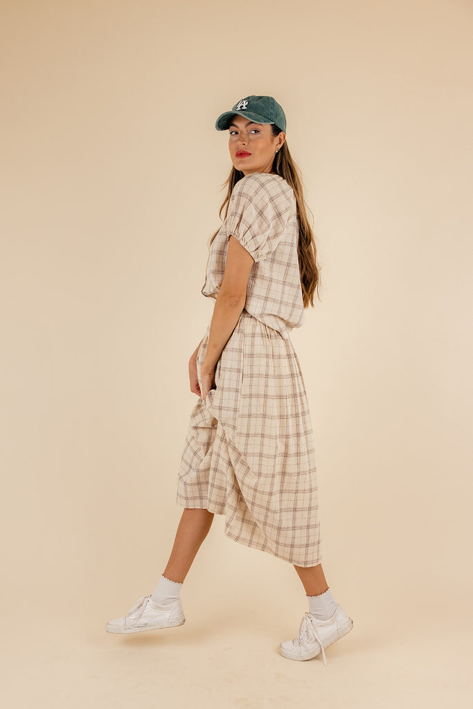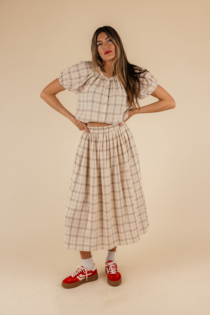 Featuring a gathered neckline, puff raglan sleeves, and delicate mother-of-pearl buttons, the Coretta Plaid Blouse is effortlessly chic. Pair it with the matching skirt for a put-together look or style it solo for a touch of everyday charm!