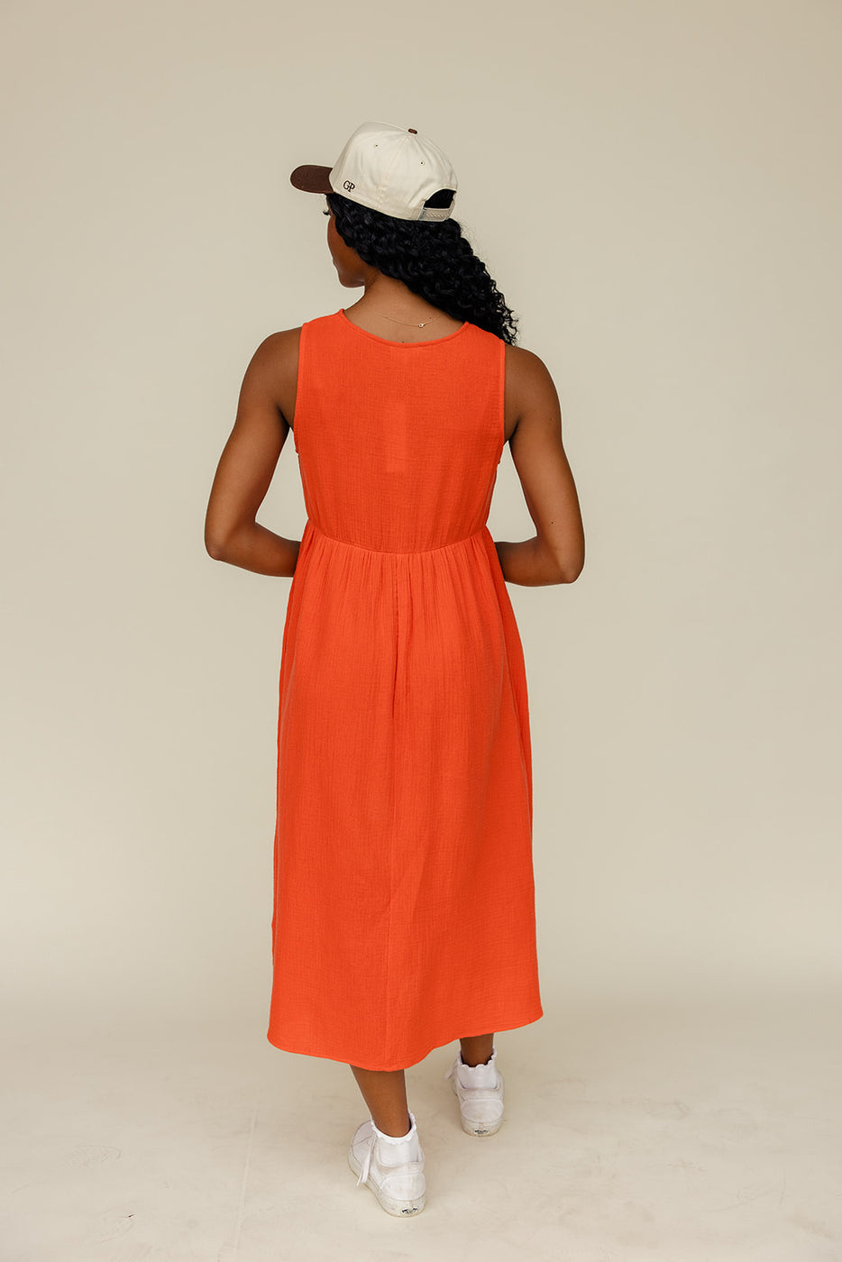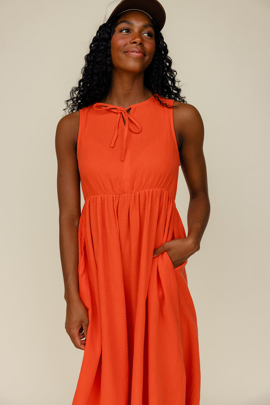 Bright, breezy, and effortlessly cool — this sleeveless orange midi dress features a gathered waist, scoop neckline with a tie detail, and handy side pockets. Made from lightweight gauzy fabric, it’s the perfect throw-on-and-go look for sunny days.