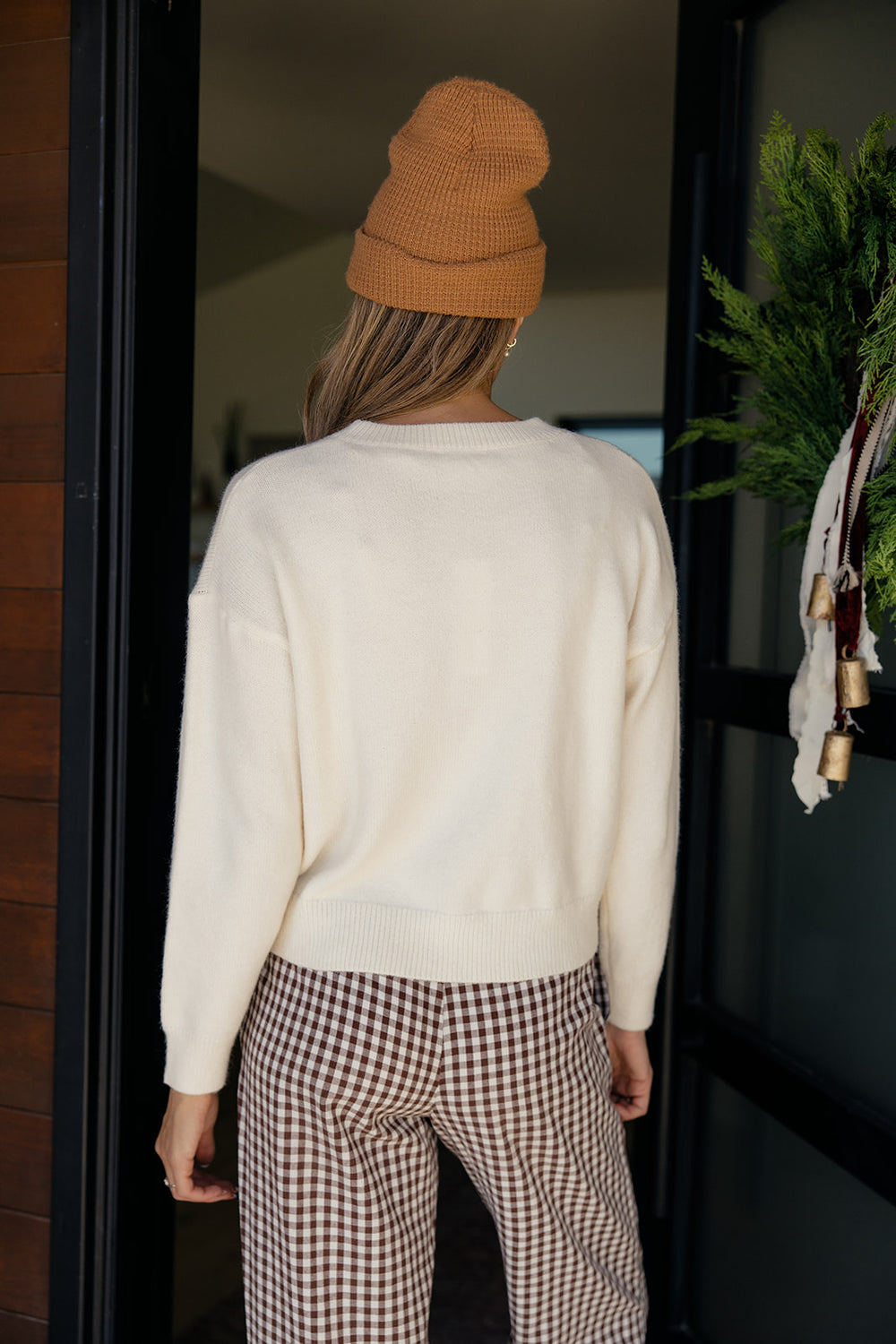 Make spirits bright. This cheerful ivory sweater features a bold red “MERRY” graphic across the front and a classic crew neckline — perfect for adding festive charm to any winter outfit.