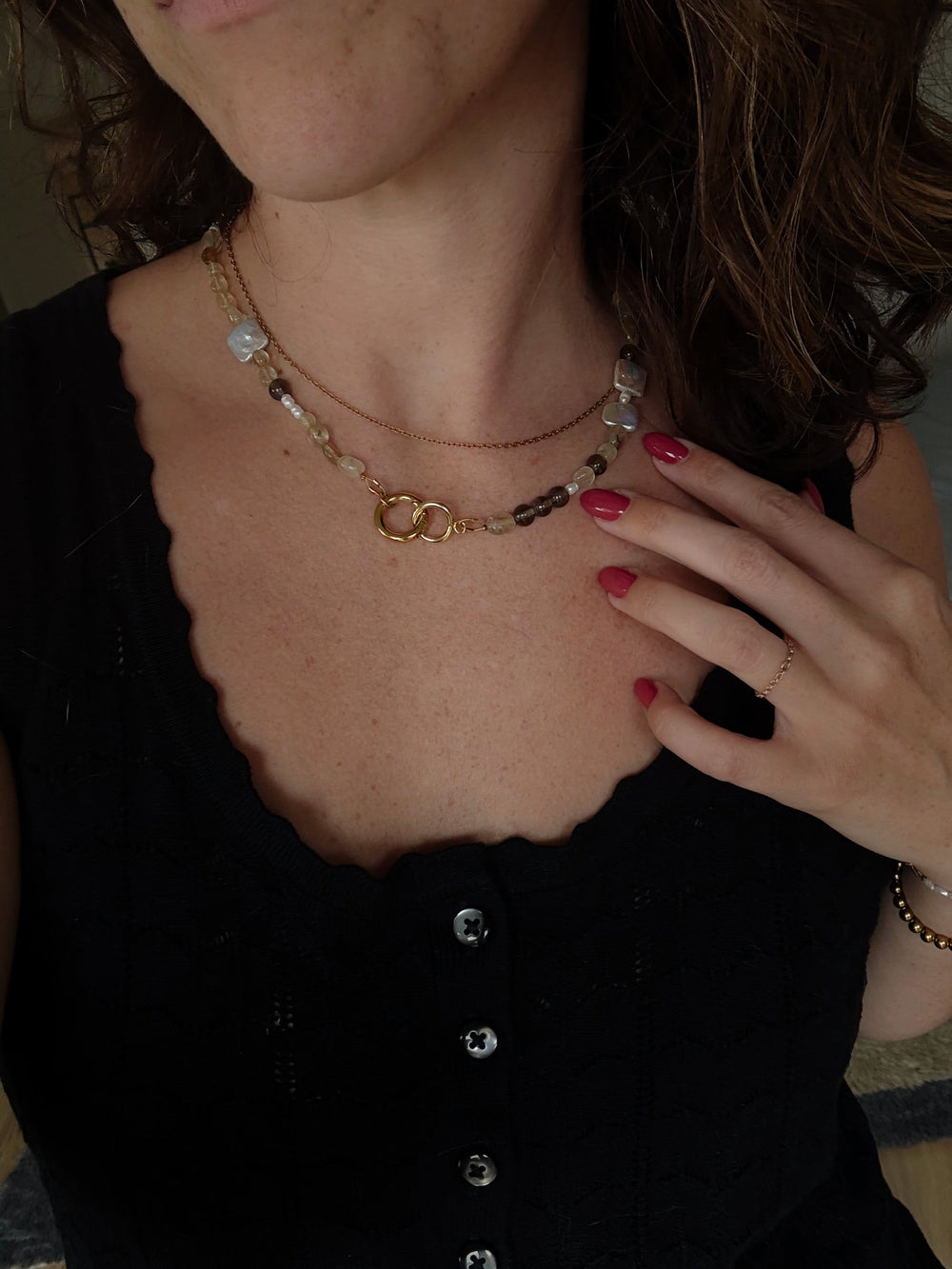 Handmade with a unique blend of earthy gemstones and luminous pearls, this necklace brings effortless sophistication to any look. Featuring irregular rutilated quartz, smoky quartz, tiny rice pearls, and square freshwater pearls, each bead adds its own natural character and shimmer. Finished with a gold-filled linked closure, this design is as versatile as it is timeless—perfect for layering or wearing on its own.