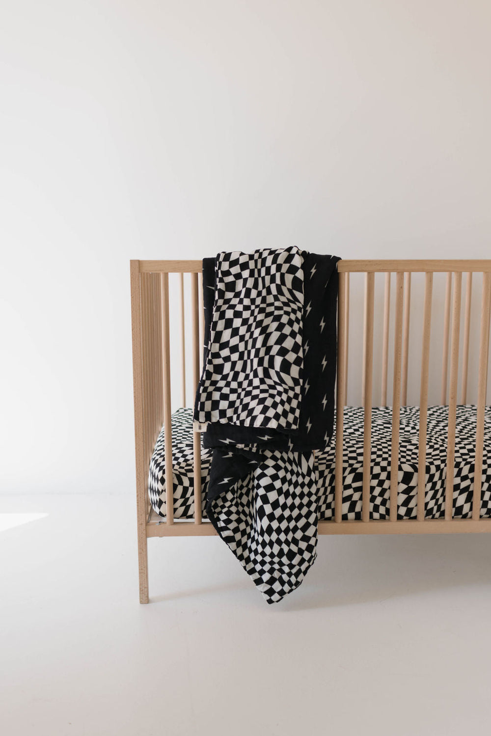 Featuring our midnight lightning bolt print and black & white wavy checkerboard design on the other, this quilt is perfect for your little one's nursery. Its soft muslin material provides comfort and warmth, making it a must-have for any baby. **be sure to check out our matching crib sheet**
