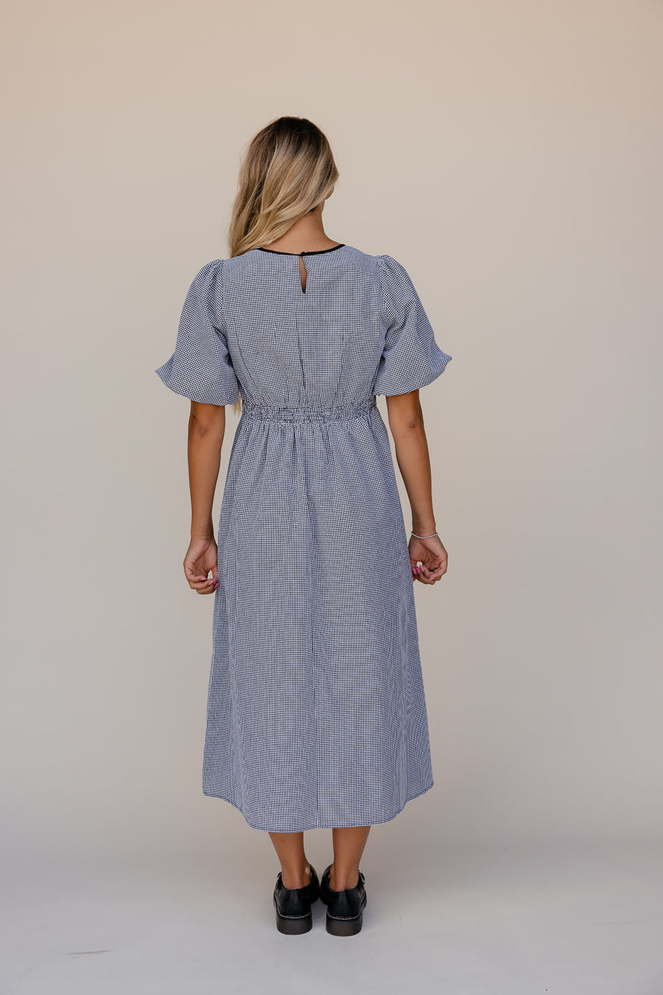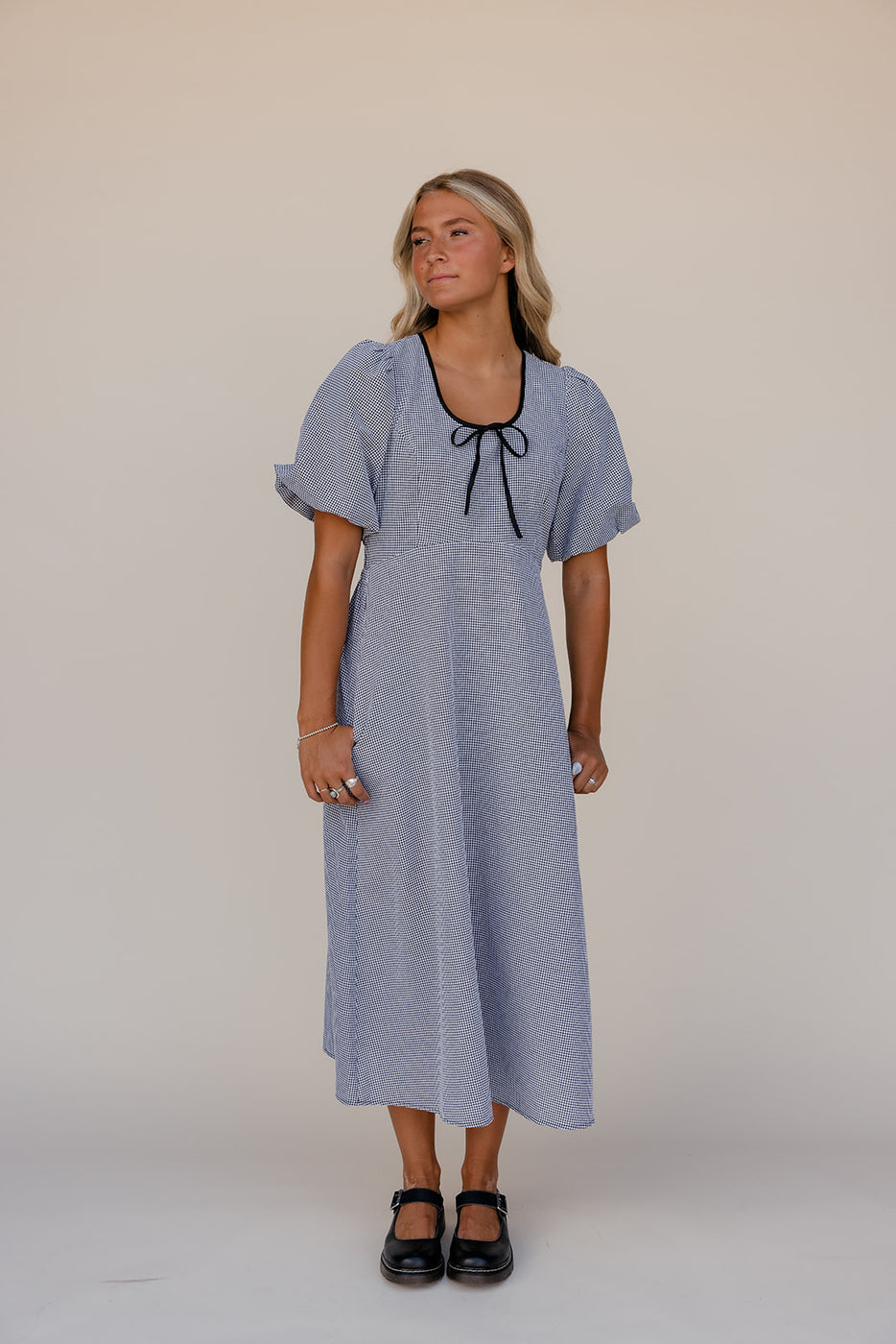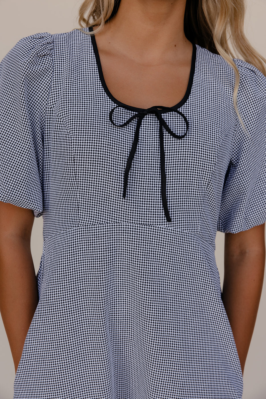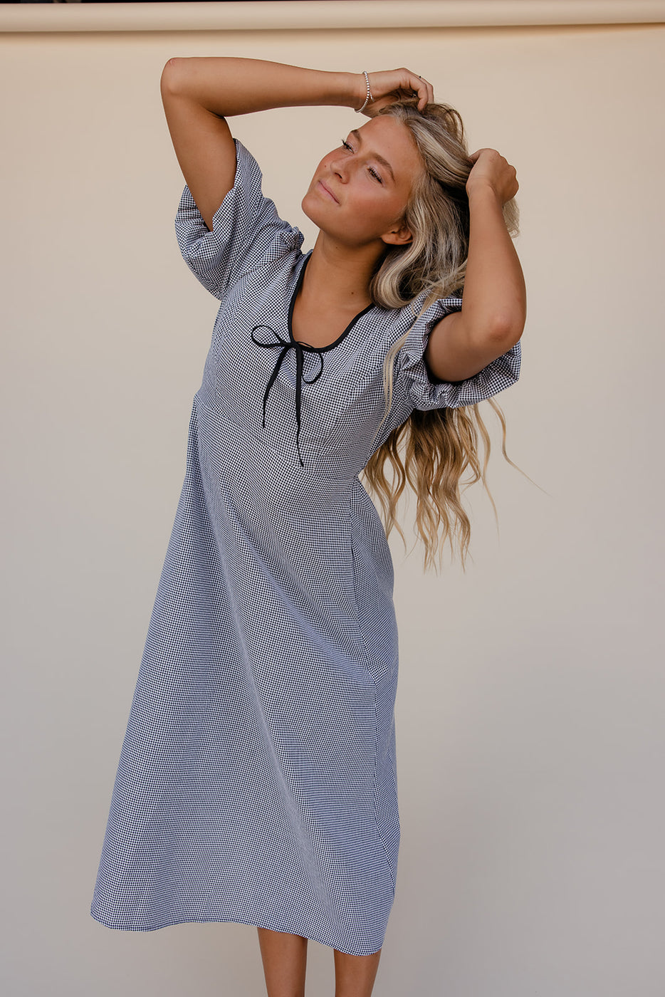 This black gingham dress is effortlessly charming, featuring a scoop neckline, adjustable tie detail, and sweet puff sleeves. The classic print and flattering fit make it an easy go-to for picnics, brunch, or any sunny day outing.