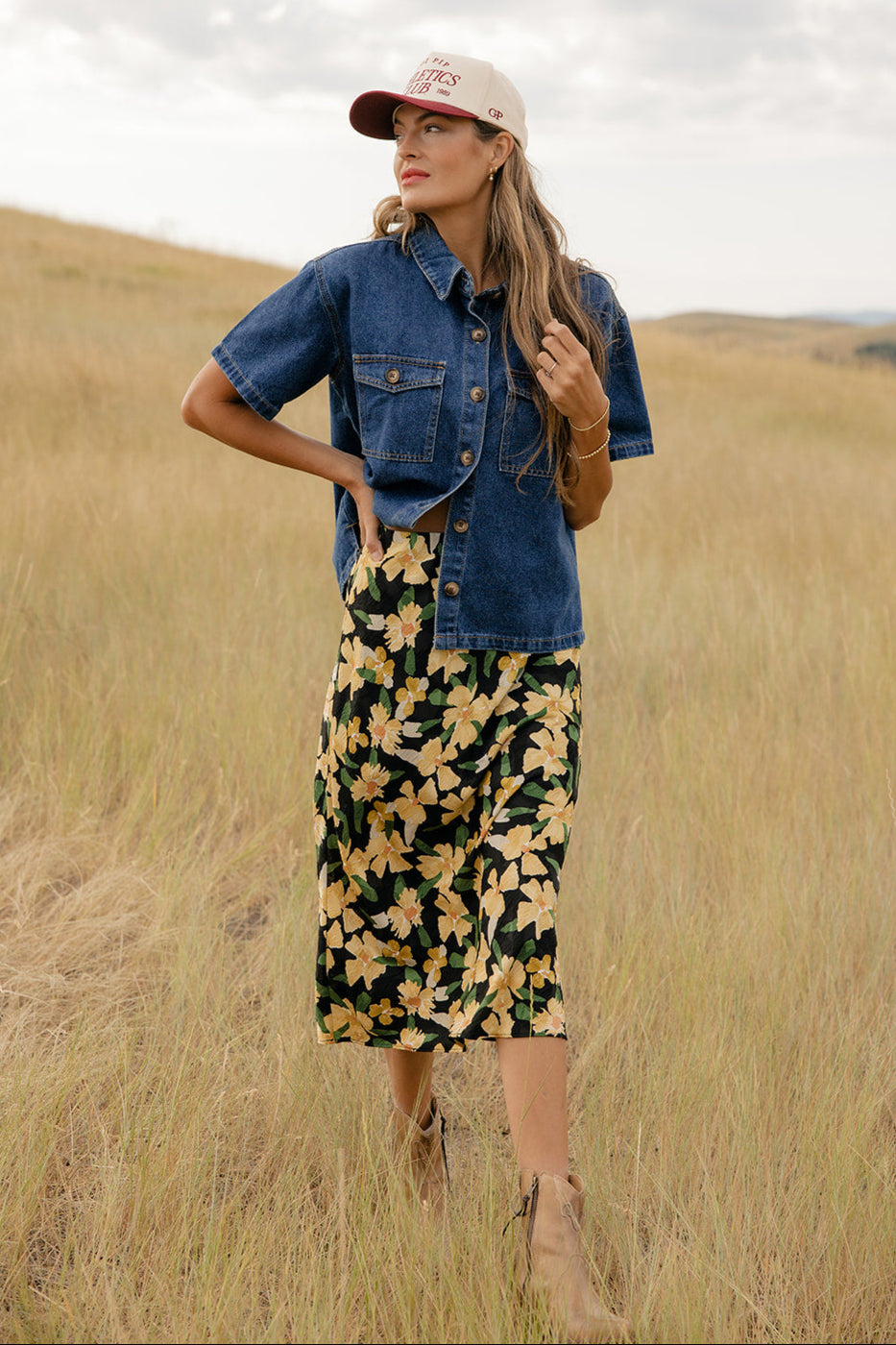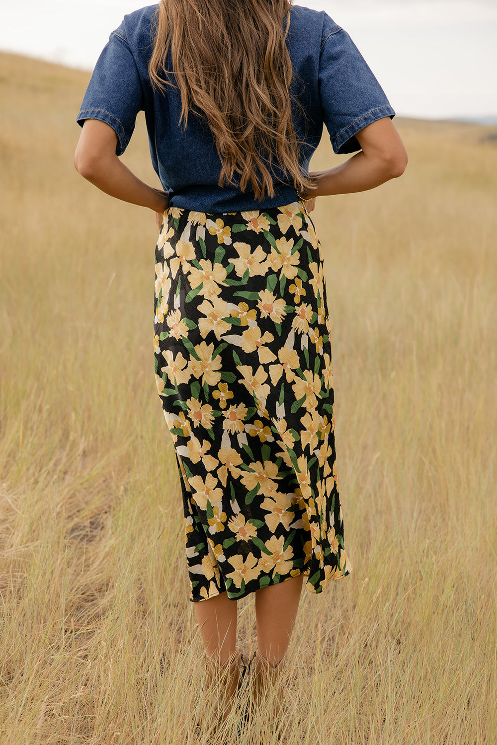 A soft black midi skirt scattered with yellow florals and finished with an elastic waist—versatile and easy to wear.