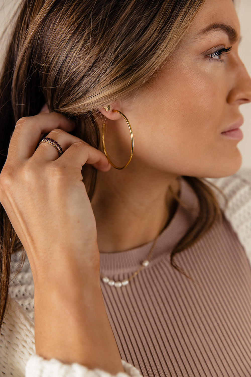 If you're looking for the simplest pair of hoops to finish off all your looks, the Delia is perfect. The simplicity, the gold finish, and the closure are what we're loving about these hoops. Catch me wearing these everyday with everything I own!