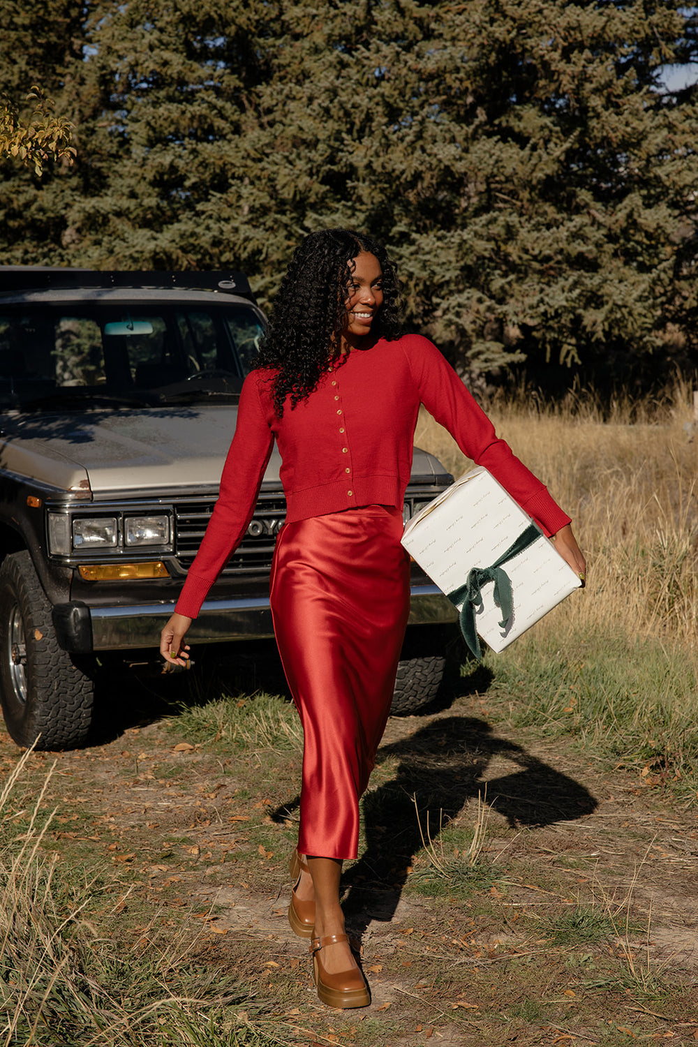 A silky statement piece that shines for the season. With a flattering drape and radiant sheen, this satin midi is perfect for parties or polished everyday looks.