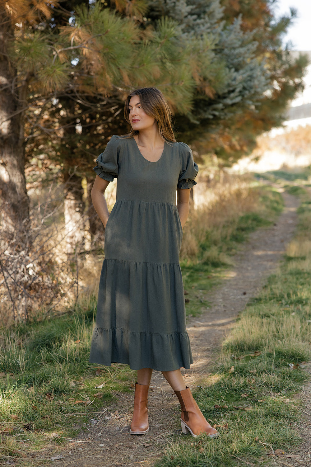 A fall favorite. This rust-toned tiered midi dress flows with ease, offering comfort and style in one effortless silhouette.