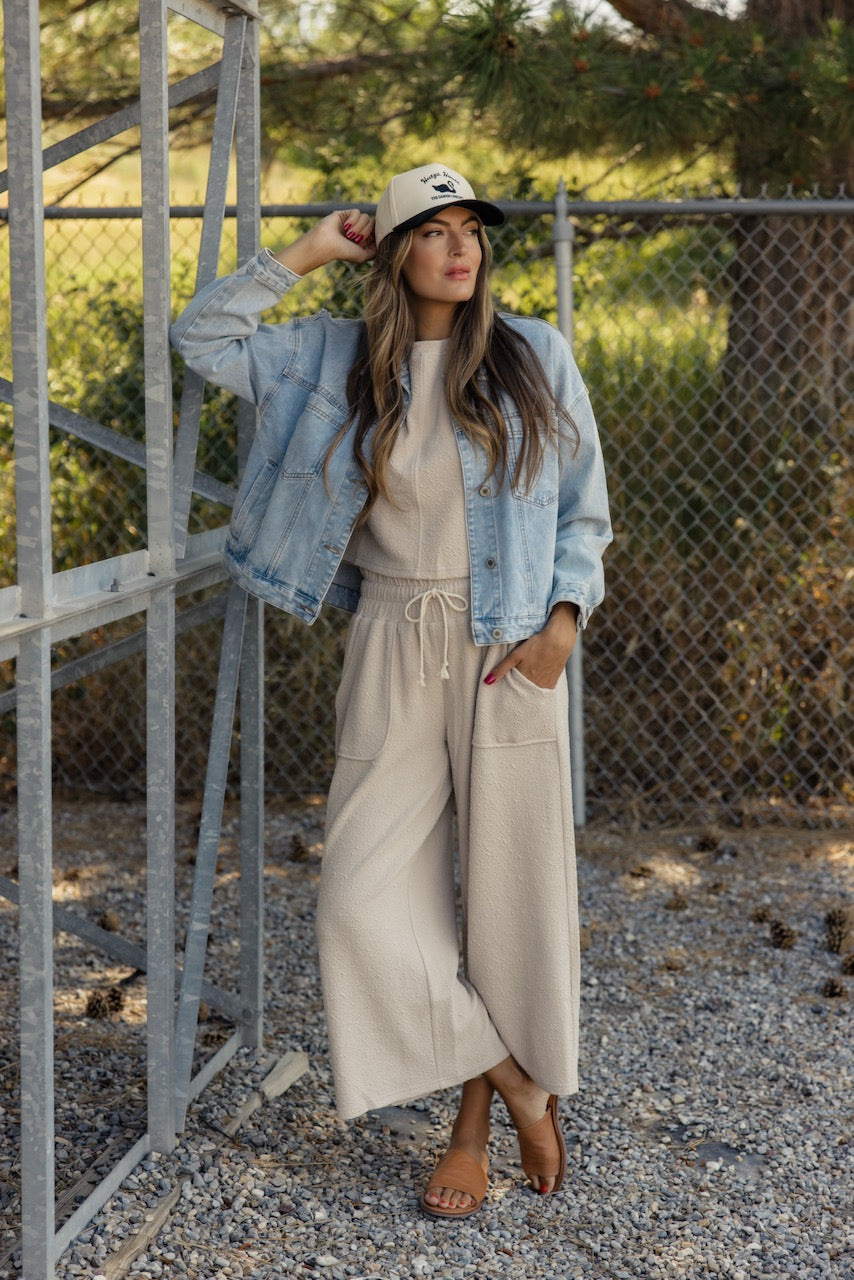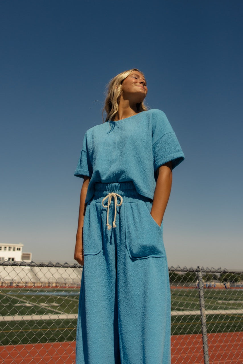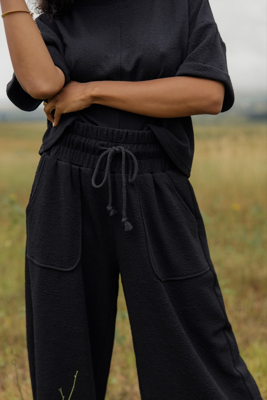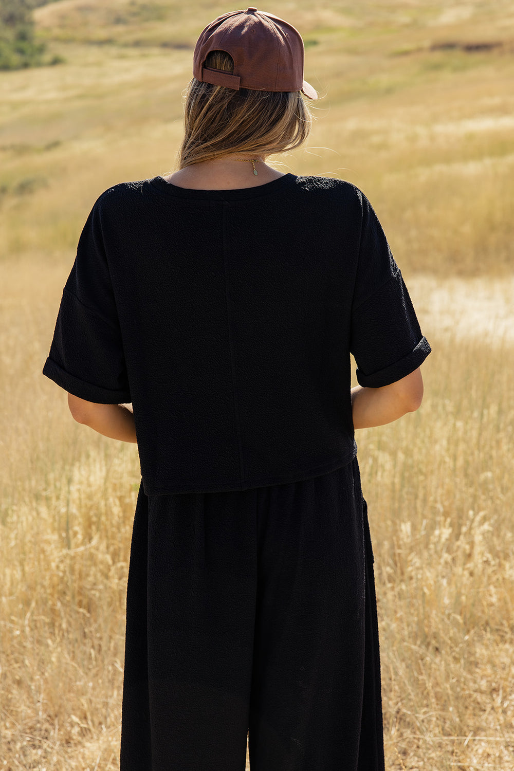 Featuring a drop-shoulder cropped top and wide-leg pants, this set is truly the perfect pairing. Crafted from luxuriously thick, textured fabric, these pieces exude a distinct allure that effortlessly elevates this everyday ensemble.