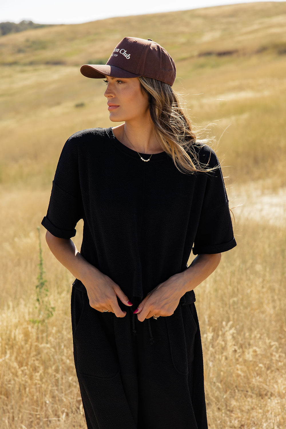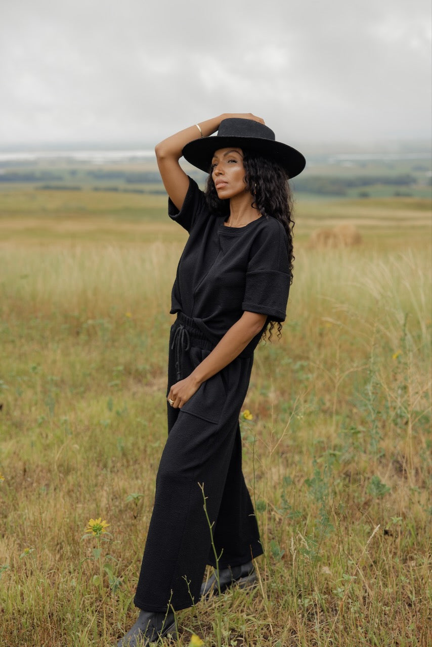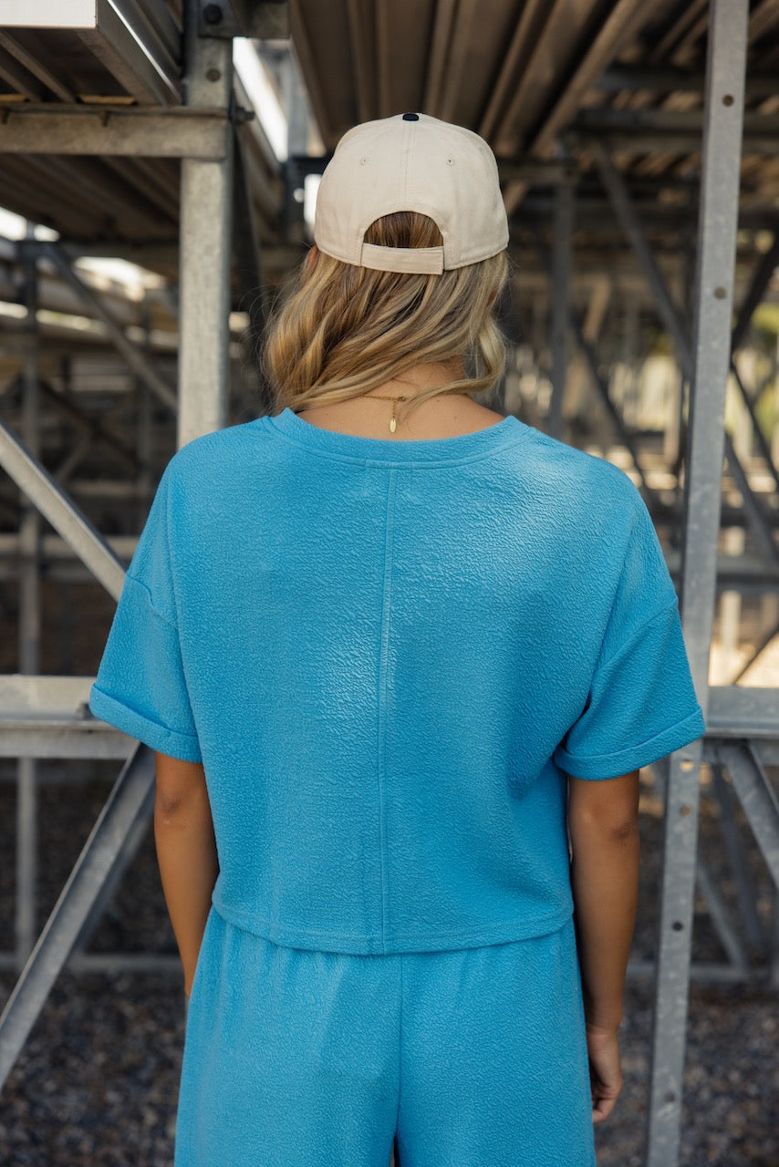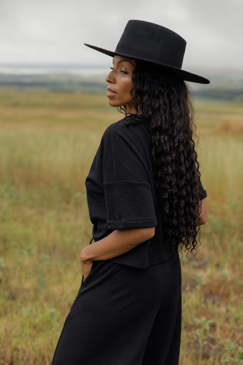 Featuring a drop-shoulder cropped top and wide-leg pants, this set is truly the perfect pairing. Crafted from luxuriously thick, textured fabric, these pieces exude a distinct allure that effortlessly elevates this everyday ensemble.