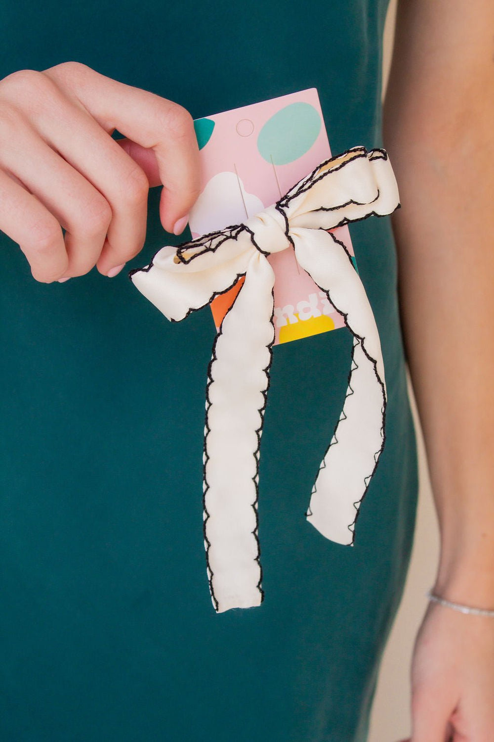 Every shop Andi accessory is specially designed to be comfortable, stylish, and practical, and our bows are no exception! This medium bow clip is absolutely a must. Made with a cream ribbon, featuring a black scalloped trim, it matches any hairstyle and outfit, seamlessly, and attached to an alligator clip, it's so easy to apply.Â