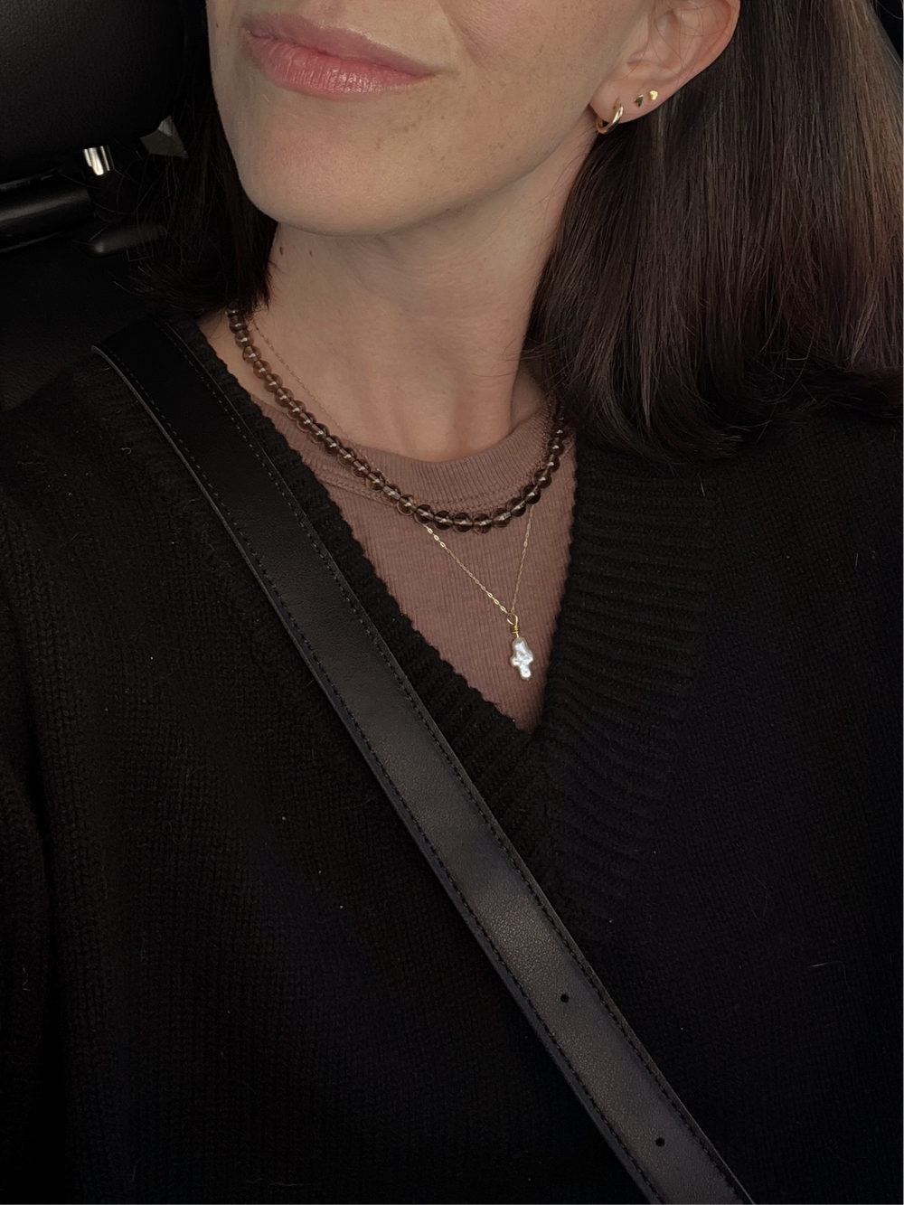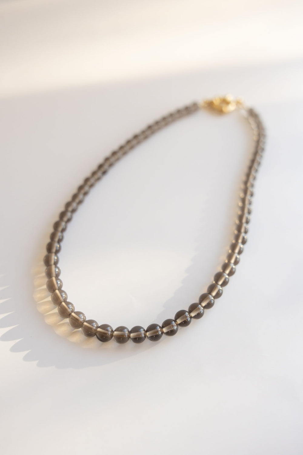 Handcrafted from 6mm brown smokey quartz gemstones and gold plated 15mm spring ring closure