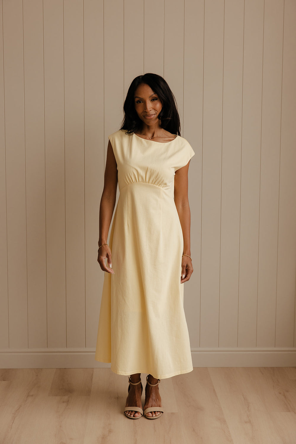 A dreamy yellow midi dress for women with soft draping and an effortlessly elegant fit.