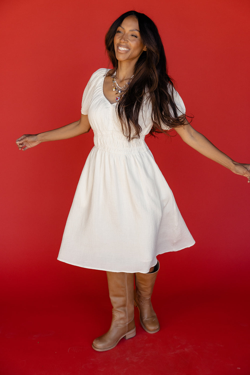 The Sophie Smocked Dress is your new go-to for easy, feminine style. It features a comfy smocked waist, puff sleeves, and a breezy knee-length fit. The crisp white fabric keeps it classic and versatile. Perfect for sunny days or dressed-up moments!