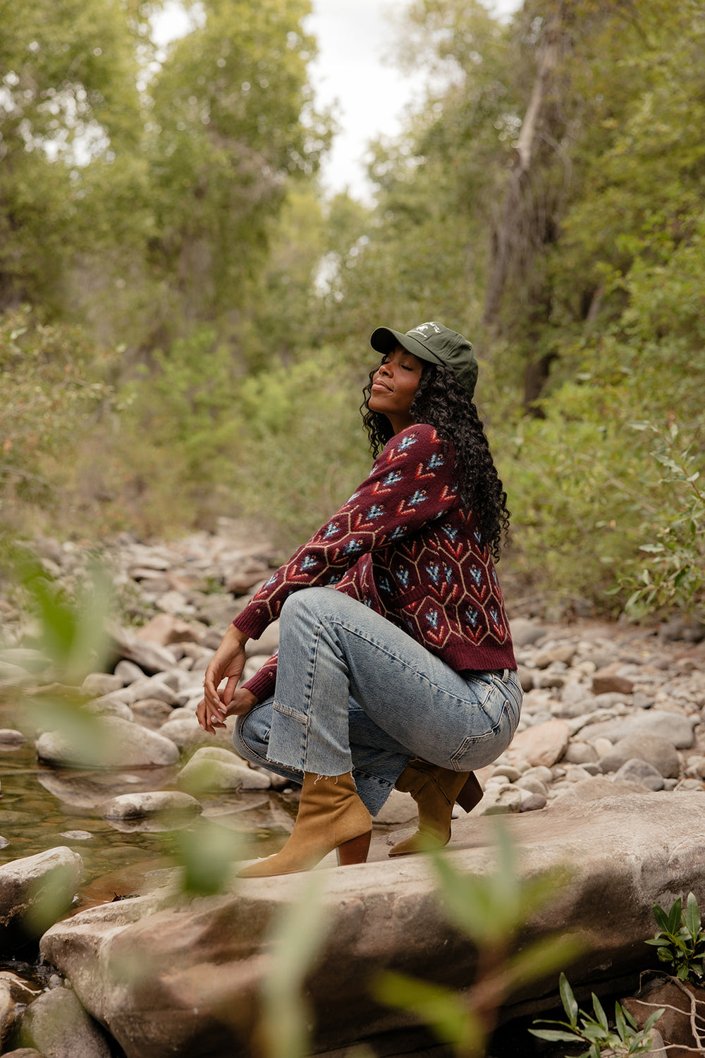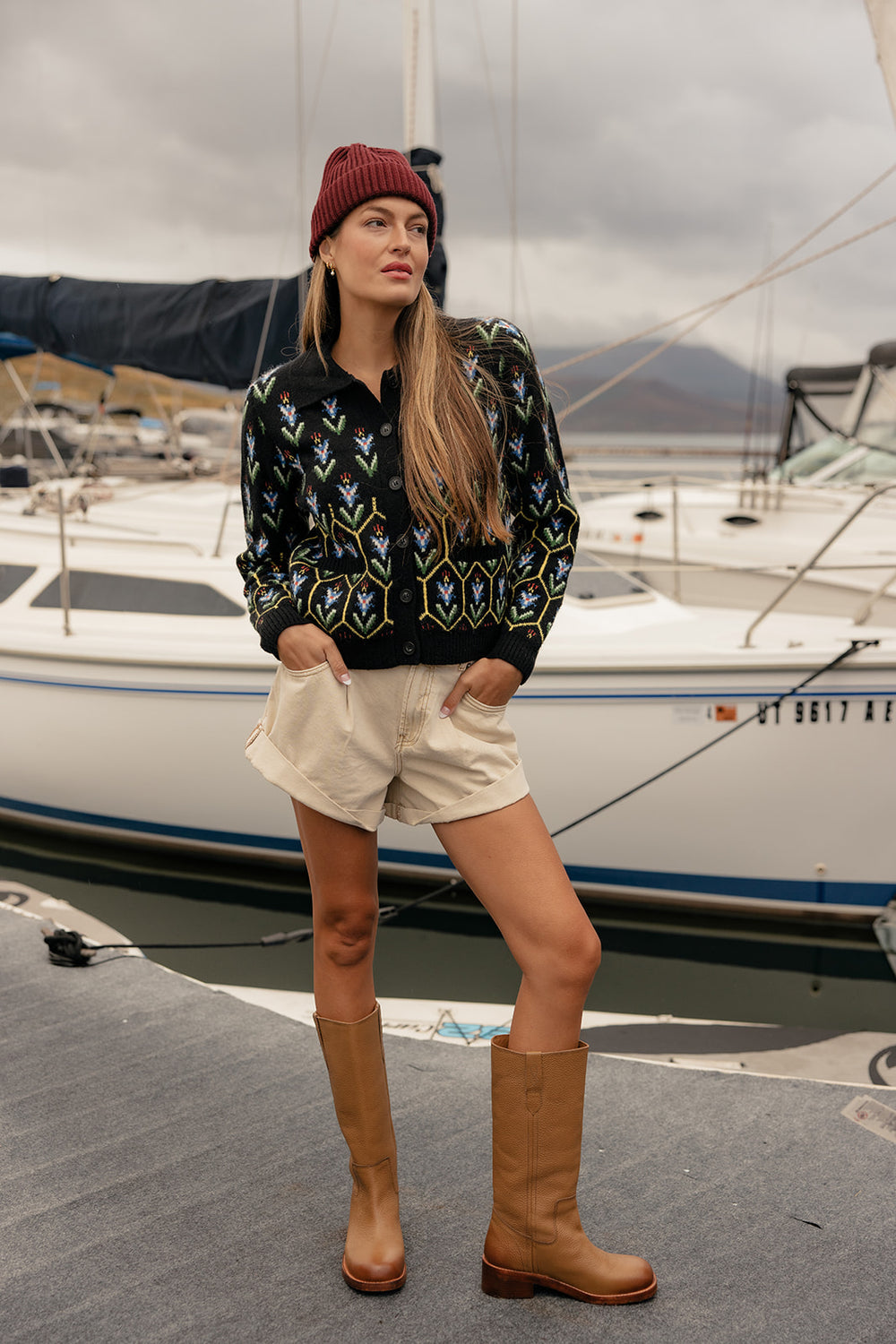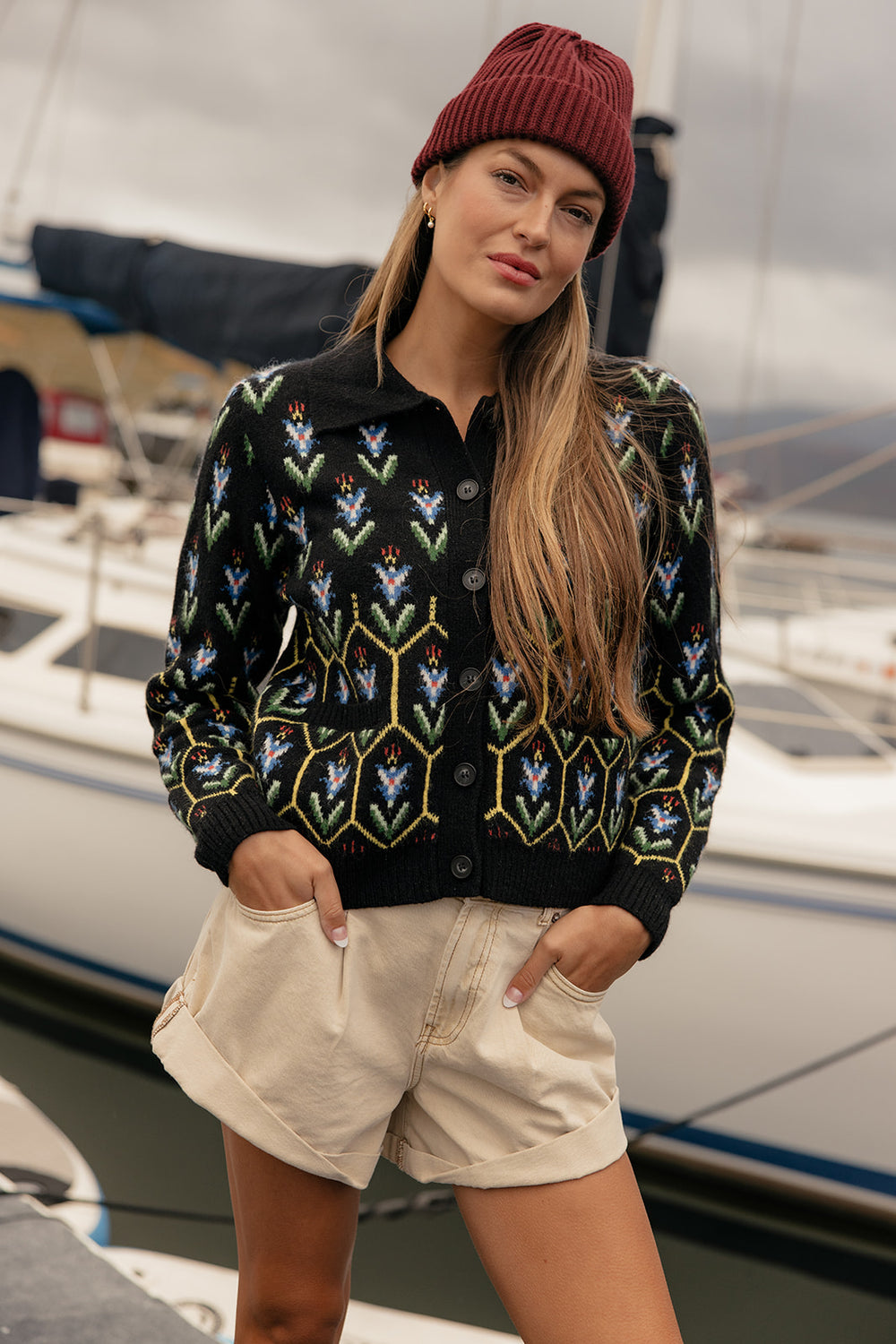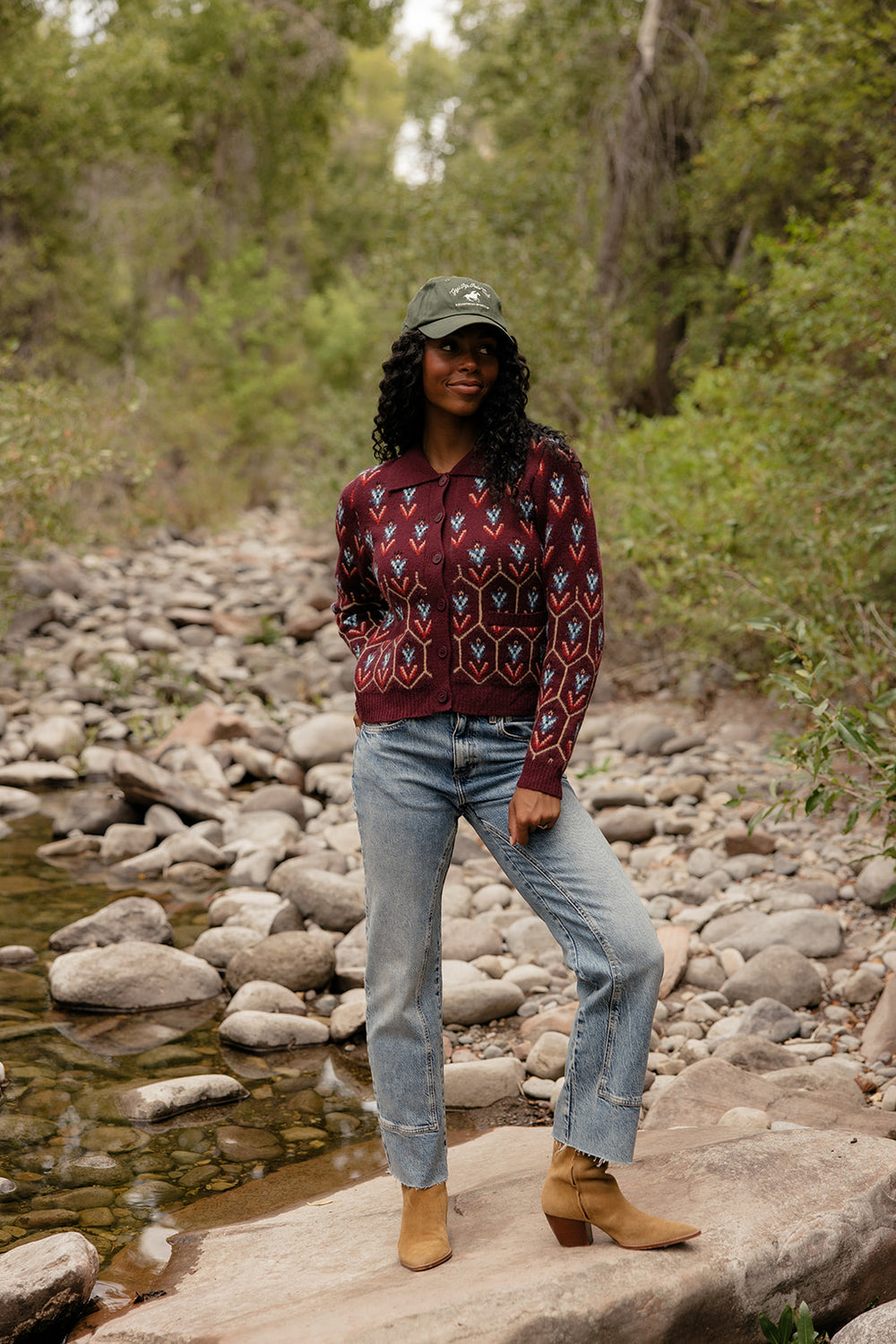 Bold geometric knit cardigan with a sharp collar. A statement piece that adds instant personality.