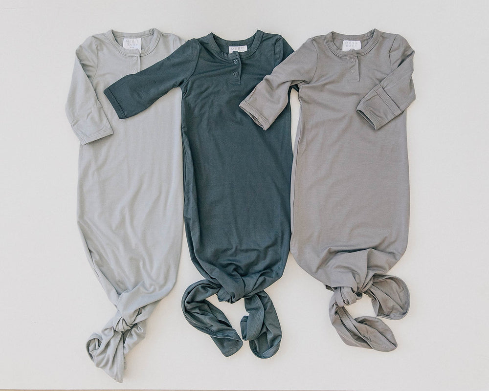 These gowns are size 0-3. They are made out of supremely soft Bamboo Rayon to keep your little one comfortable. We have a variety of gender neutral designs and colors making them perfect for any baby. They have fold over hands and two snaps for easy on and off. We also have shoulder flaps to make it easily pull over your little ones head, we want to make dressing your baby as easy as possible. The bottom is easily tied and untied in a knot for no-fuss diaper changes which makes it a newborn baby essential! These are made out of the same fabric as our stretch swaddles and match the colors of the stretch swaddles, head wraps, and hats.