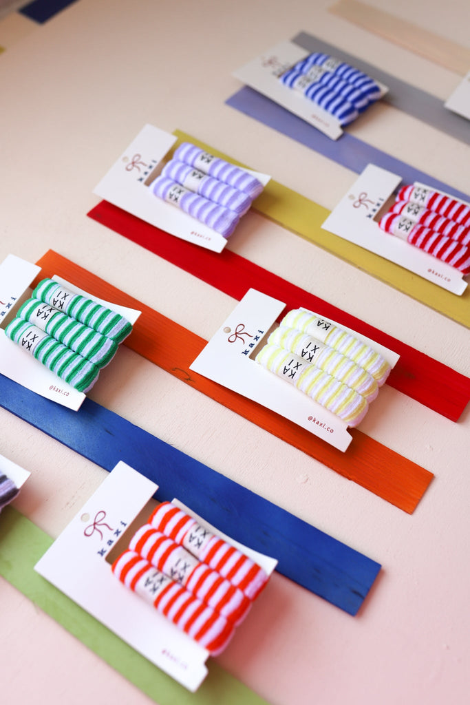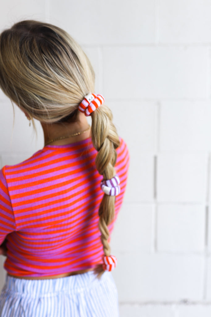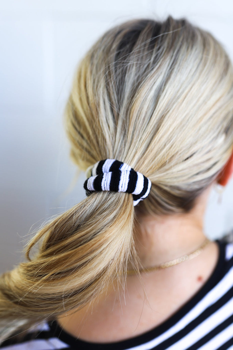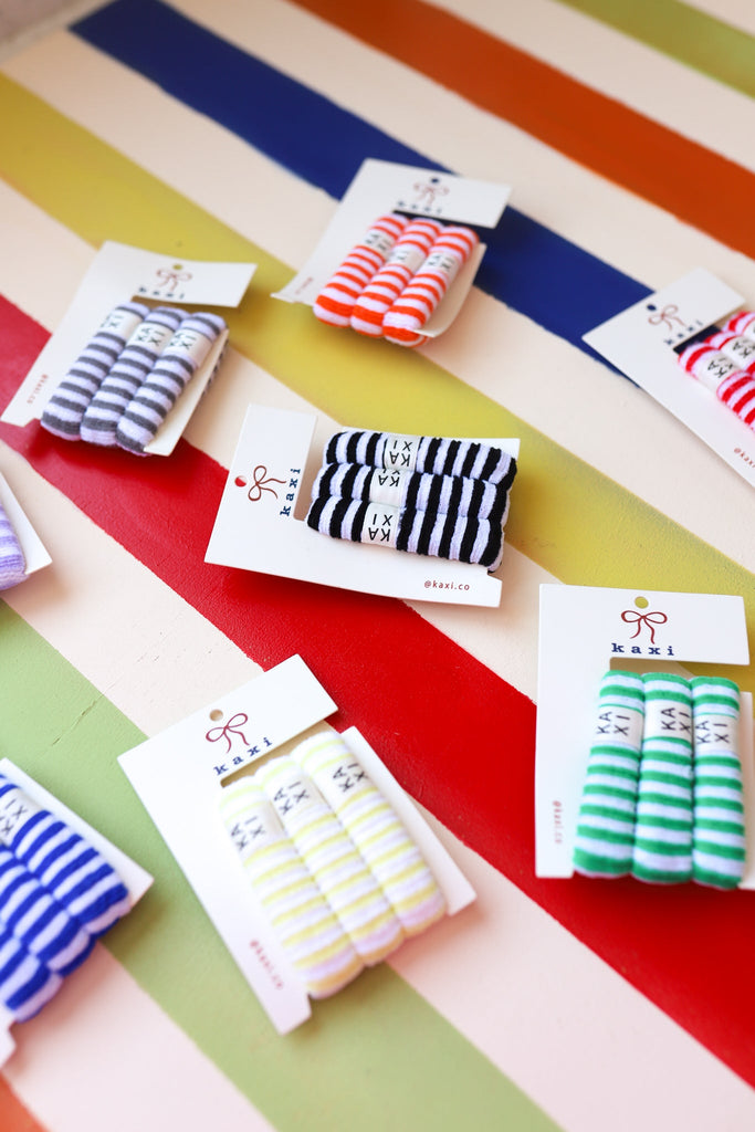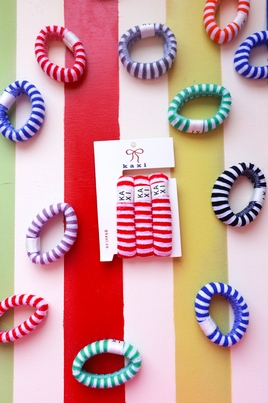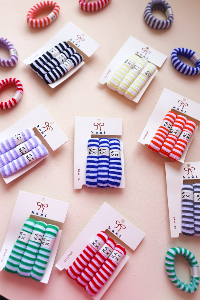 These come in a fun, bold striped print and all completed with our very own KAXI logo on it!! Crafted with a durable yet snug nylon material, these hair ties are designed to keep your hair in place without tugging or causing pain. They are perfect if you need a tight elastic for your high intensity workout, but still offer a stylish look and this elastic is just fabric with no elastic on the inside to damage your hair. Say goodbye to breakage around your face. Works for thin to thick hair! Perfect for pool days, high intensity workouts, or everyday use!