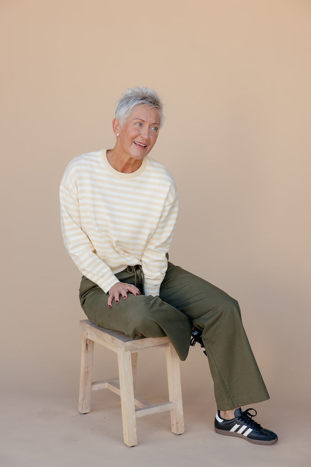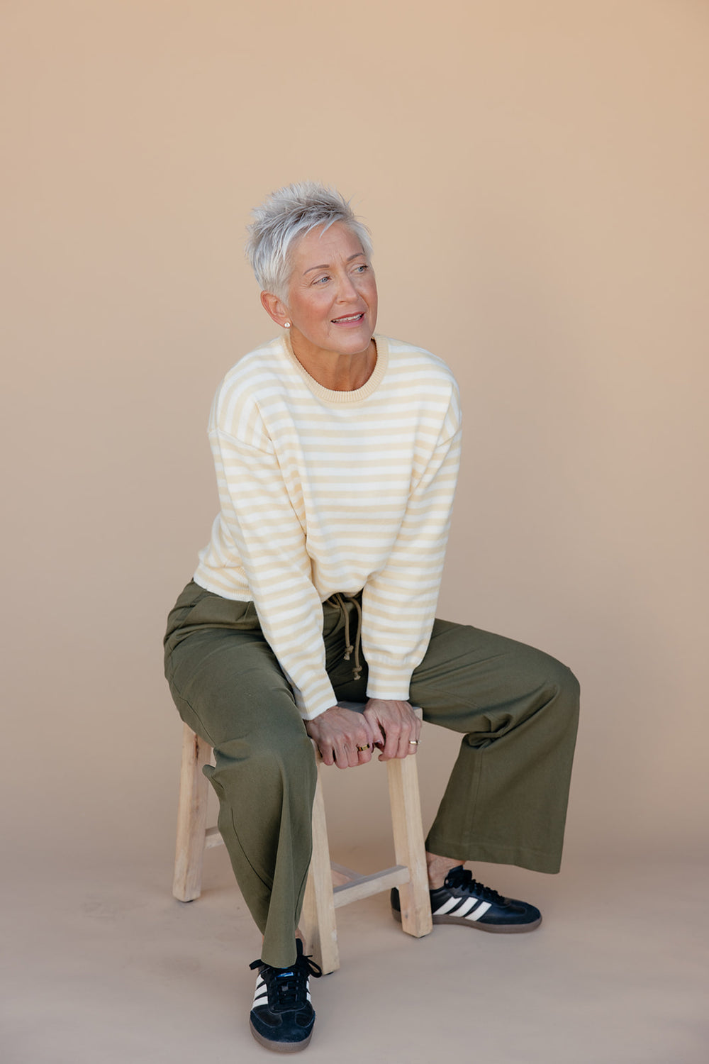 Bright and cheerful with a soft knit feel. Features classic stripes and an easy silhouette for effortless everyday wear.