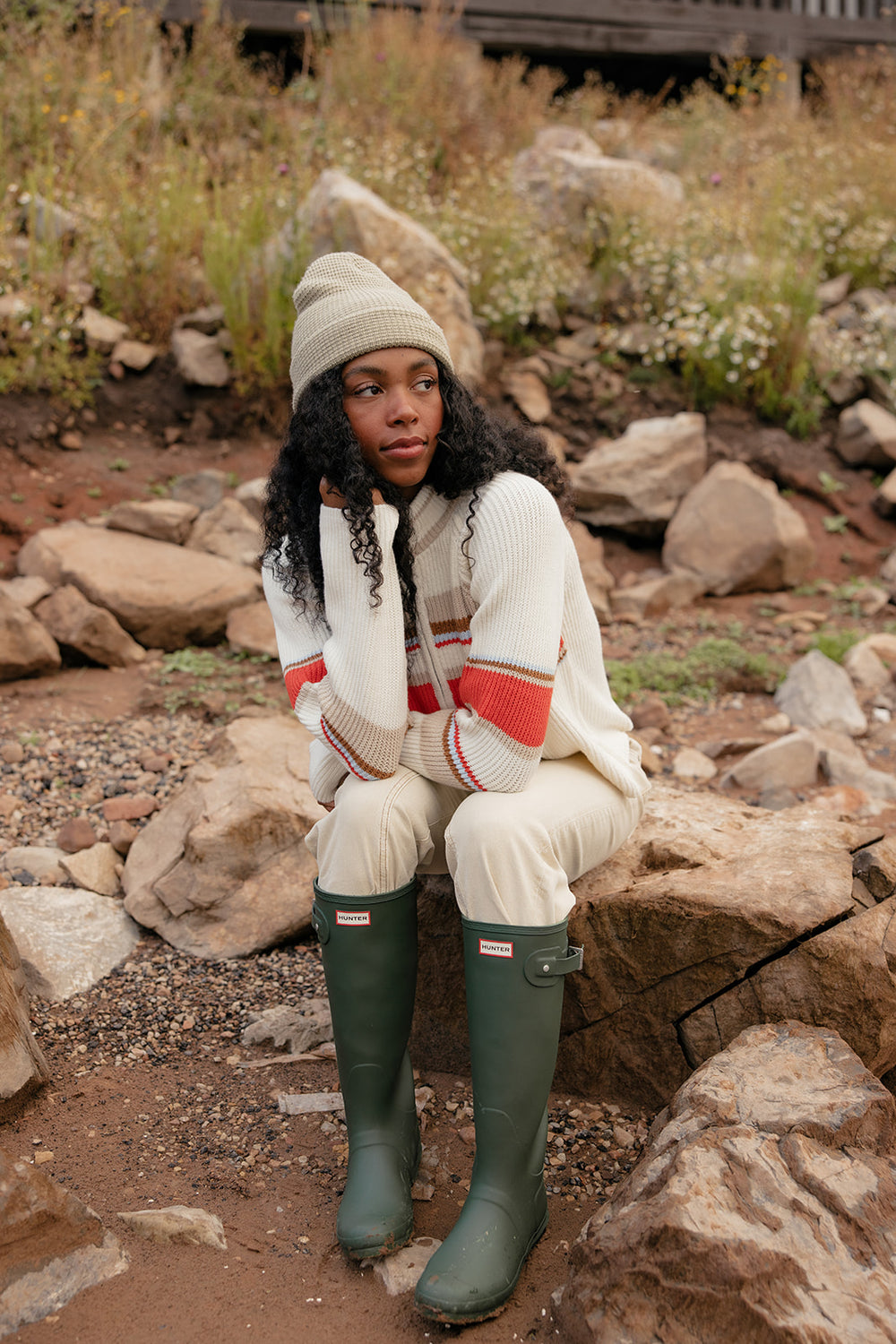Playful stripes and a zip-up neckline bring a sporty twist to this cozy fall knit.