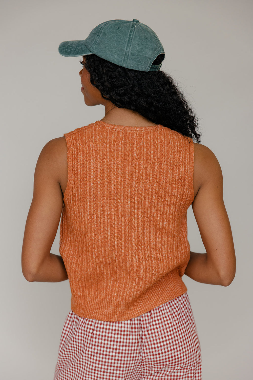 Retro ribbed knit vest in a warm rust tone. Perfect for layering over tees and blouses for a vintage-inspired look.