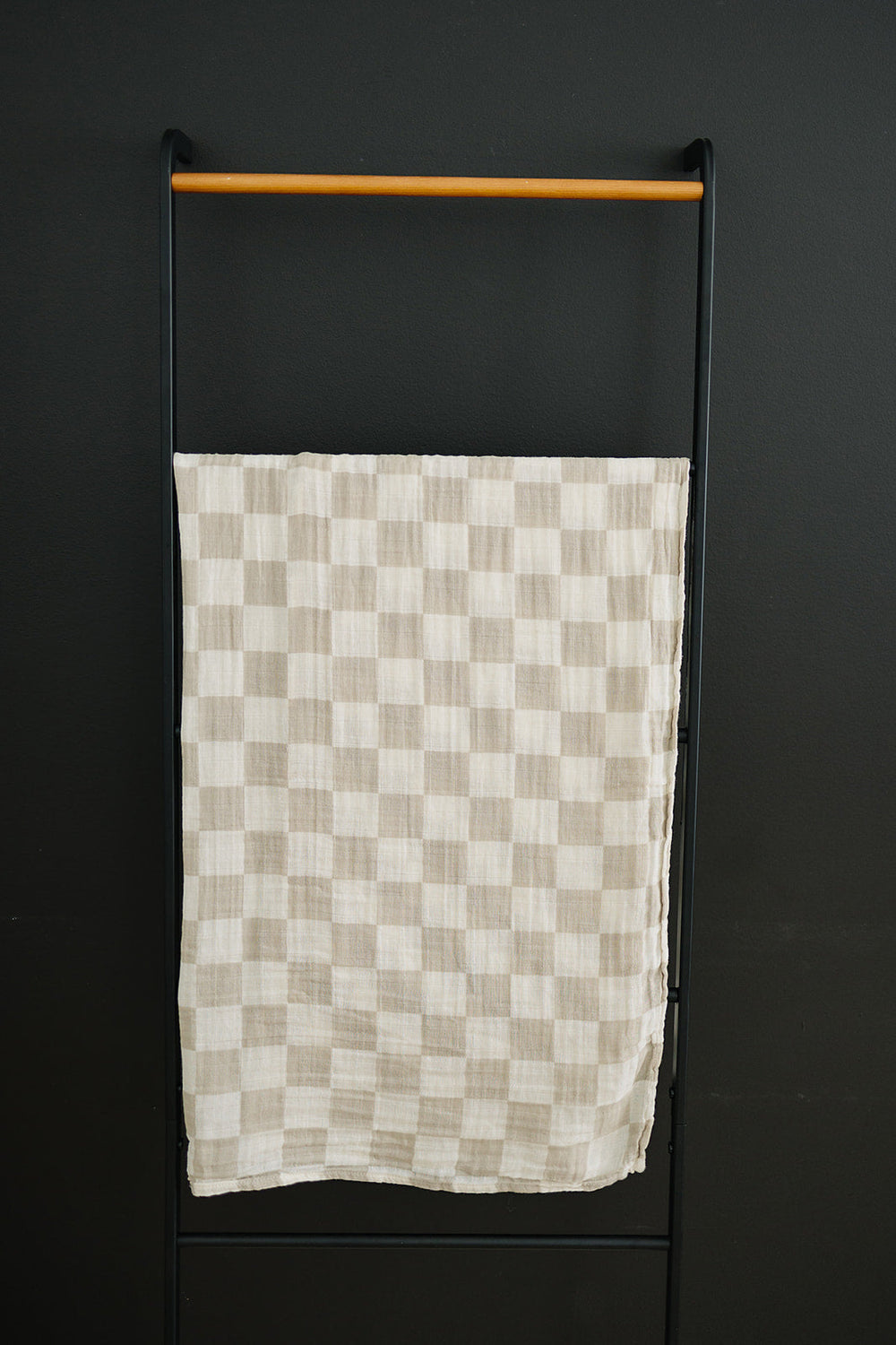 Wrap your baby in the utmost comfort with our Taupe Checkered Muslin Swaddle Blanket. Crafted from 100% Cotton, this blanket is as soft as butter and becomes even more luxurious with every wash. Designed with both parents and babies in mind, its modern and gender-neutral patterns are perfect for any age. The lightweight fabric makes it ideal for swaddling, nursing, or using in the car seat, making it a must-have for every parent. Measuring 47"x47", this versatile blanket is a baby essential that combines style and functionality.