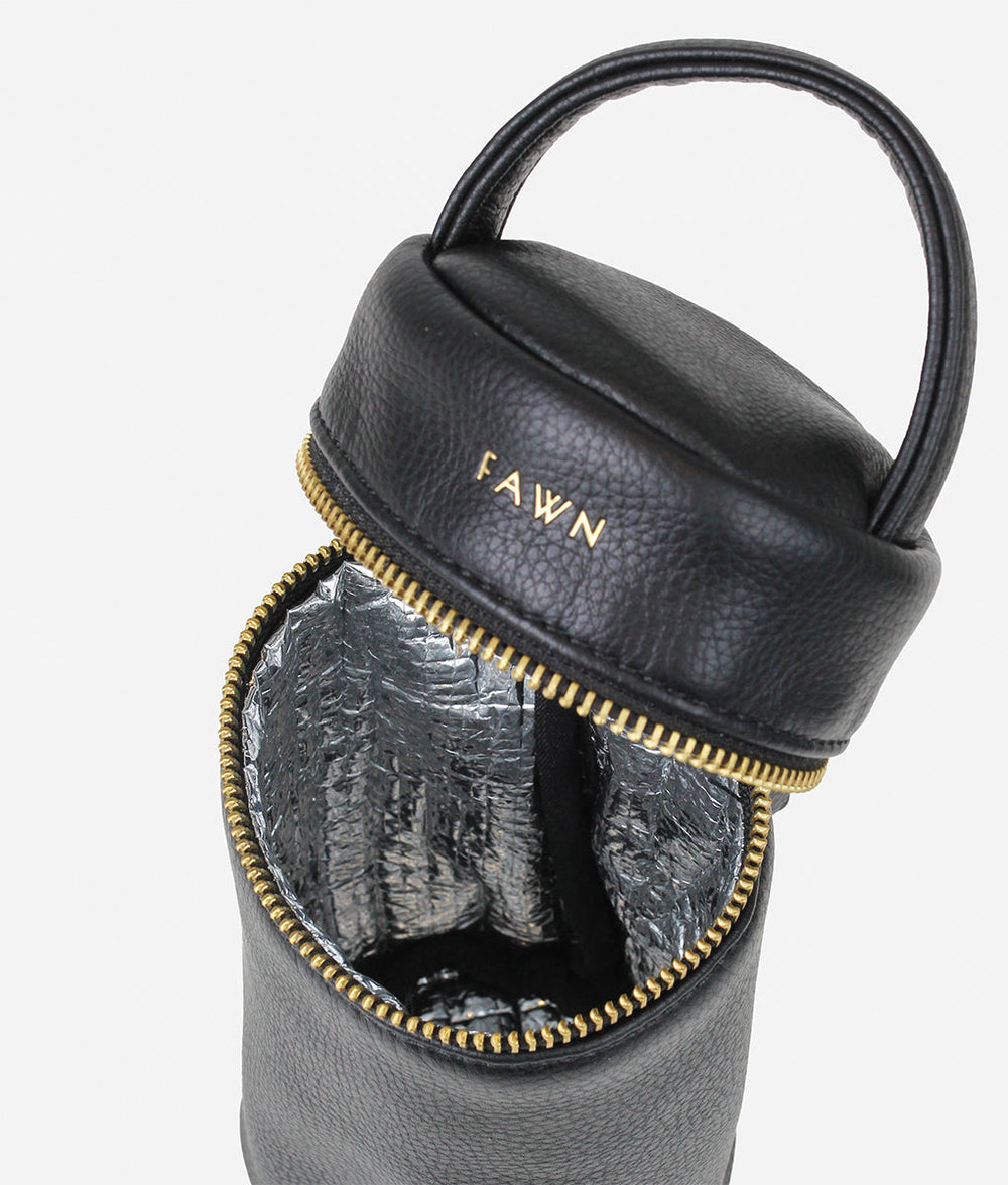 The Fawn Design Bottle Bag is an insulated (food safe tested) zippered premium pebbled faux leather bottle bag. It can fit up to one bottle and fits mostly all standard bottle sizes. It fits perfectly in the Original Diaper Bag for when you are on the go. It keeps that bottle nice and cool/warm storing that precious nectar baby needs at a moments notice!