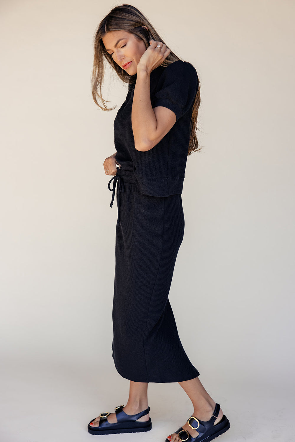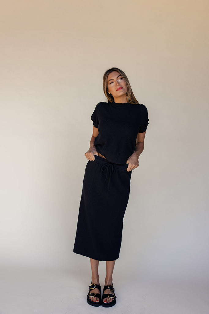 The Clash Tie Skirt is an instant classic. With a tie waist for adjustable comfort and midi length for everyday wear, this is one you will have in your closet for years to come!