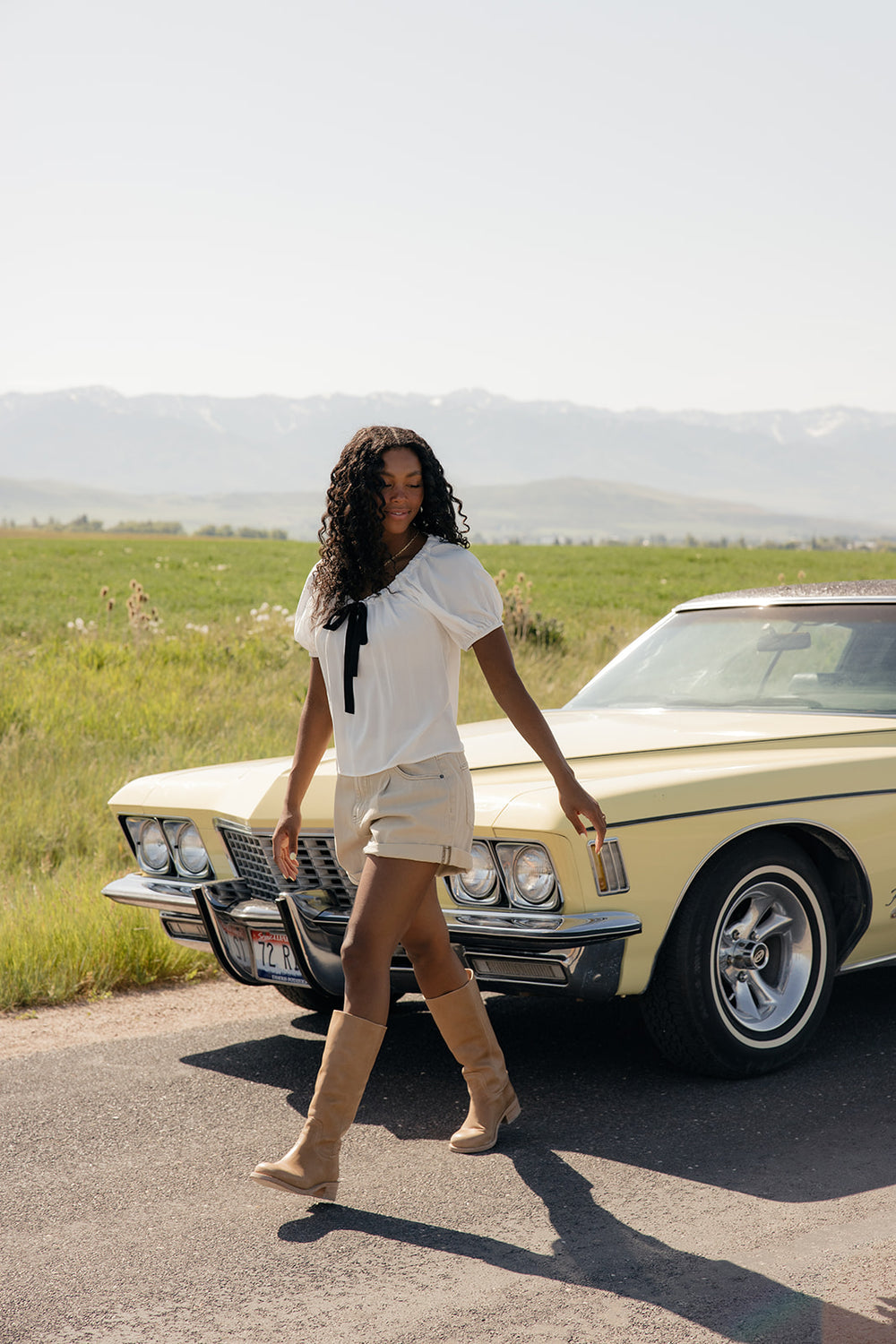 This darling bow blouse features a gathered neckline with a stunning black bow, making it the perfect choice for date night or the office. Pair with your favorite pair of jean shorts or a floral skirt this Summer!