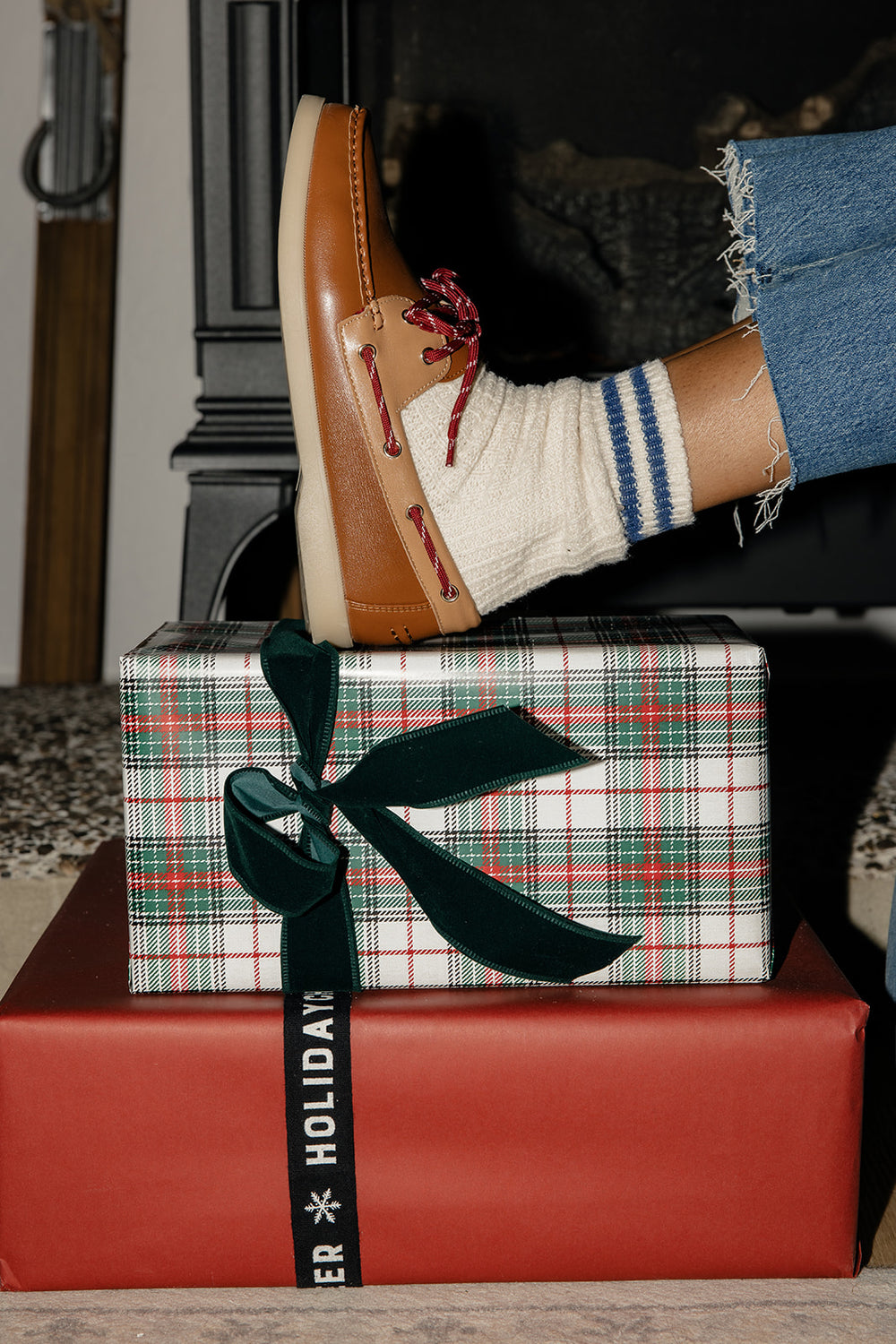 Classic brown and tan boat loafers with a pop of red tie detail—perfect for docks, drives, or days on the go.
