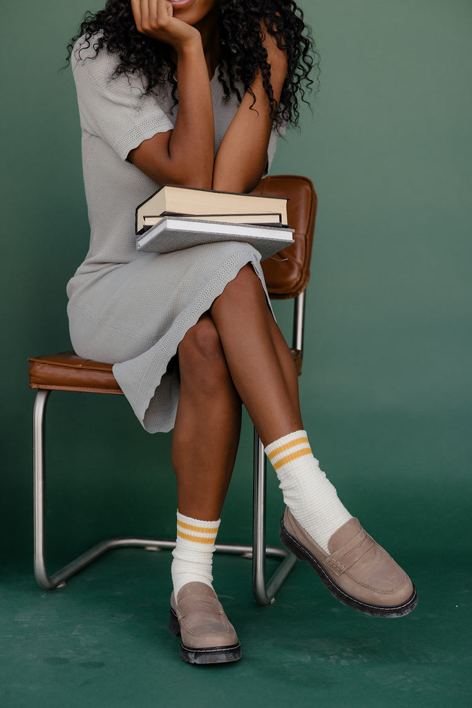 Woman sitting on a chair holding books, wearing white socks with yellow stripes and brown shoes.