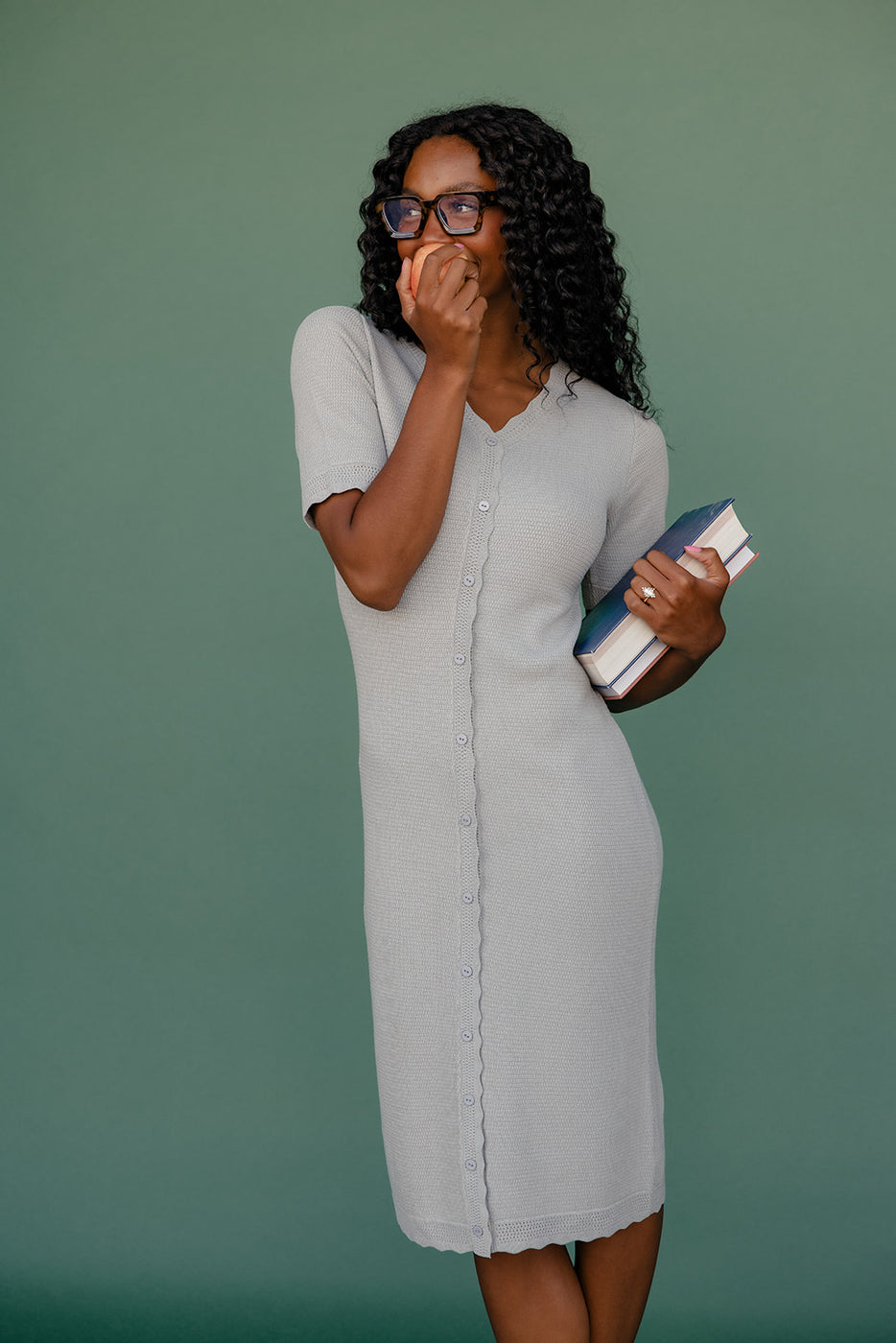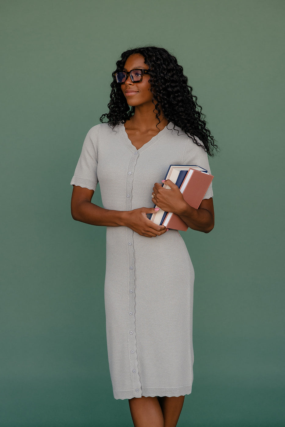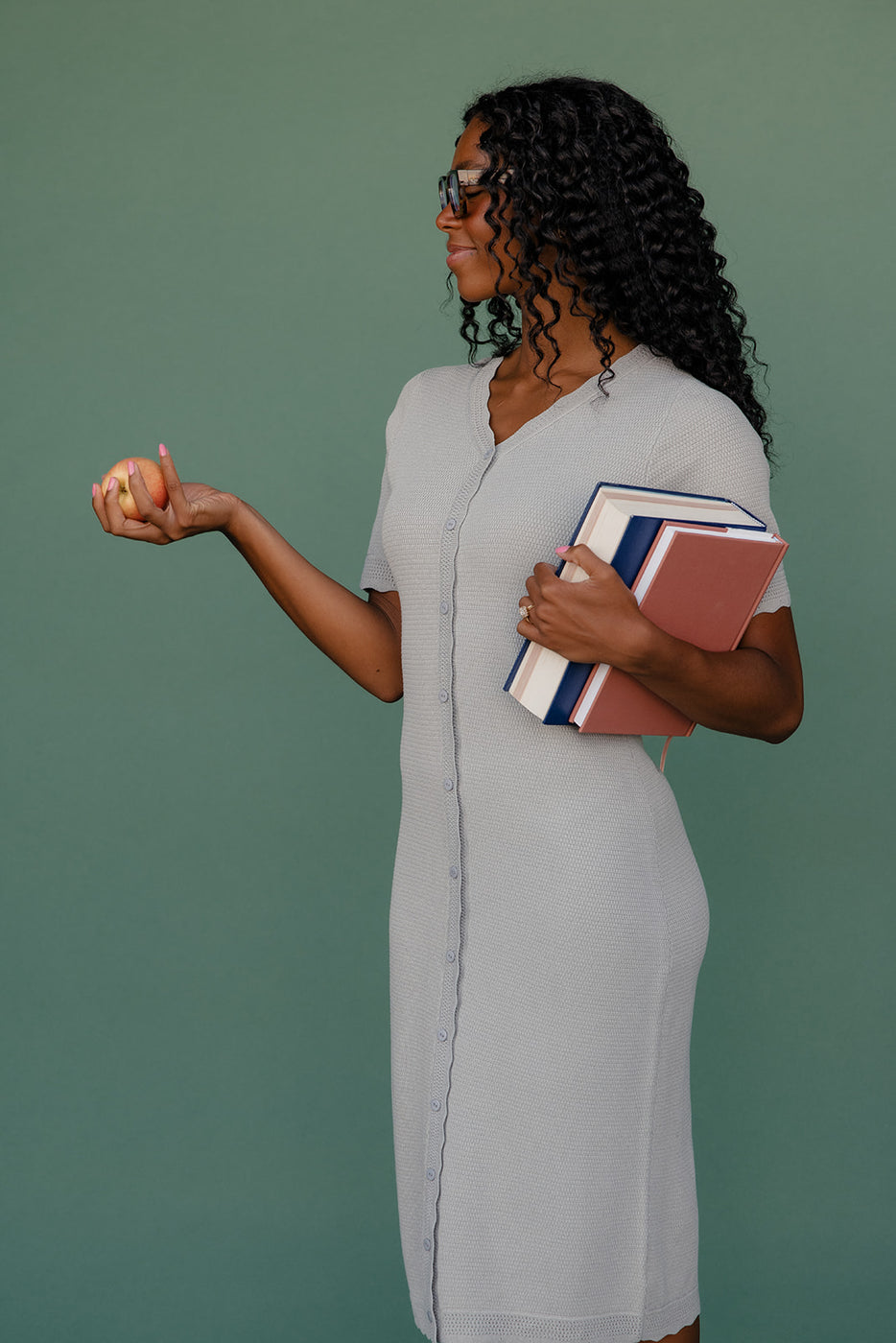 Woman in a gray dress holding books against a green background Woman sitting on a chair holding books, wearing white socks with yellow stripes and brown shoes. Close-up of a person wearing a light gray textured shirt with buttons. Woman in a light gray dress holding books against a green background Woman in a gray dress holding books and an apple against a green background Person wearing a light gray dress against a green background Woman wearing a light gray dress against a green background Woman wearing a light gray dress against a green background