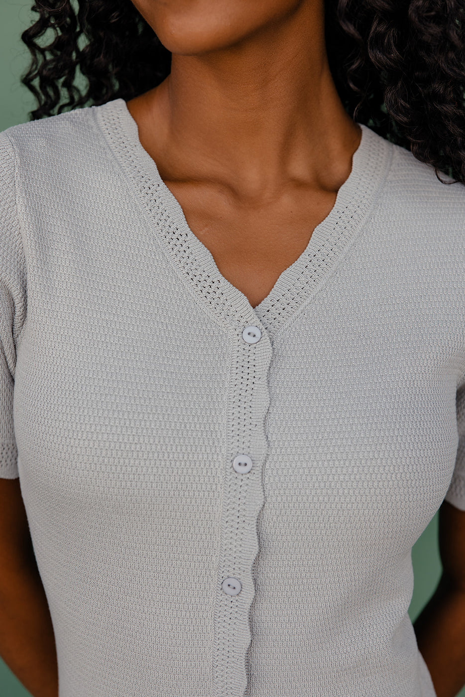 Close-up of a person wearing a light gray textured shirt with buttons.