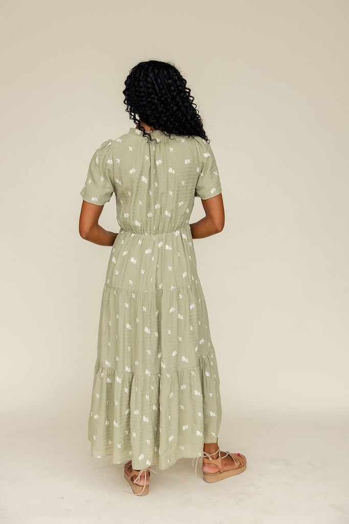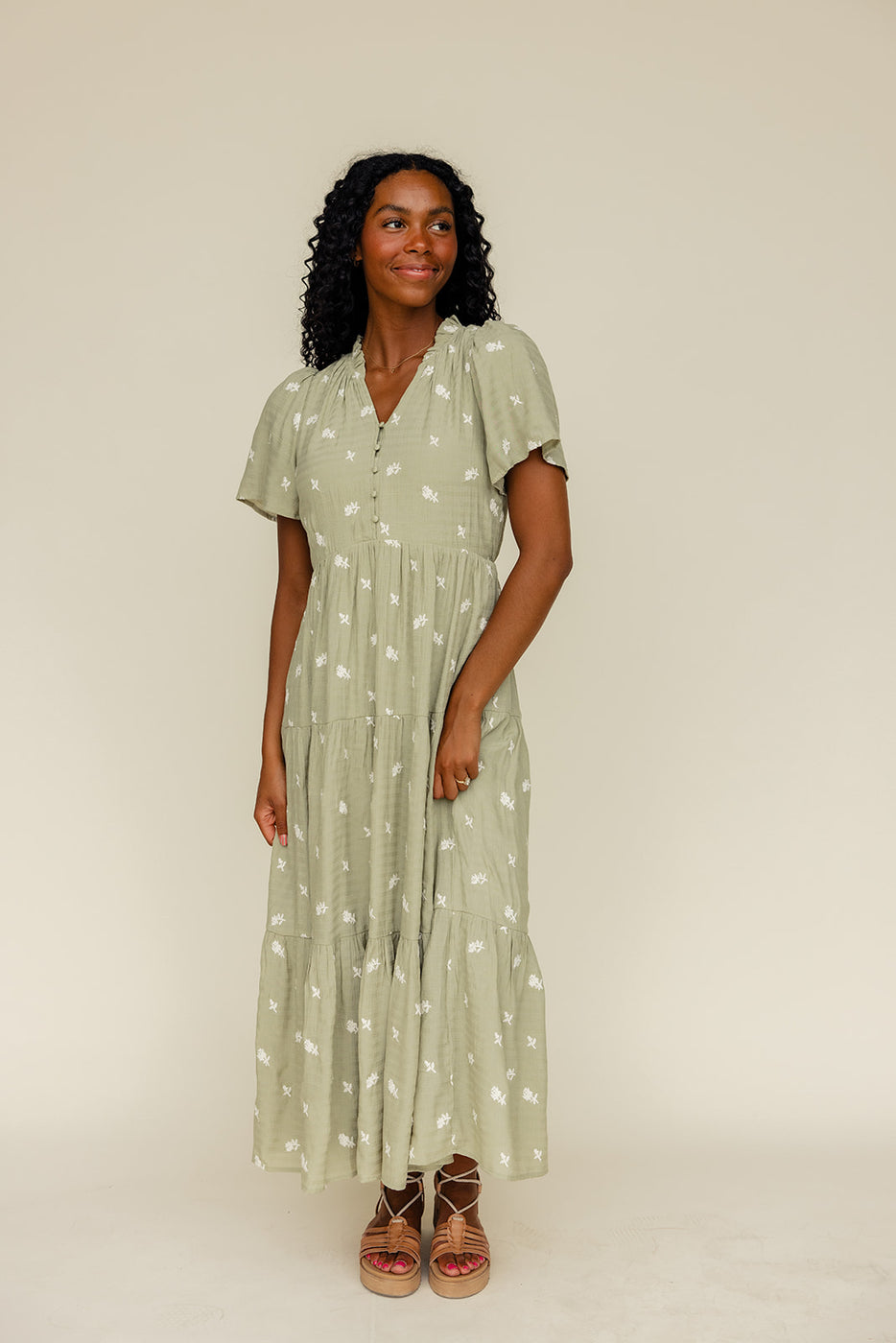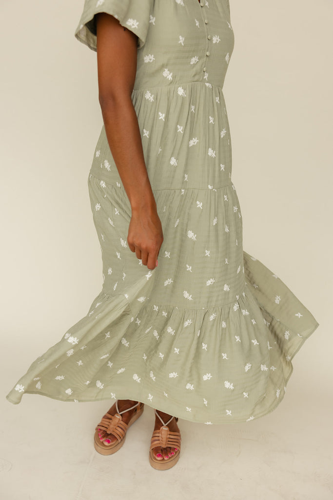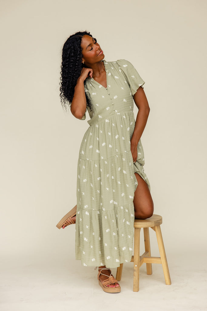 This sage green dress is breezy and feminine with delicate white floral embroidery throughout. Featuring flutter sleeves, a partial button front, and a tiered skirt, it’s an effortlessly charming piece perfect for warm days and easy styling.