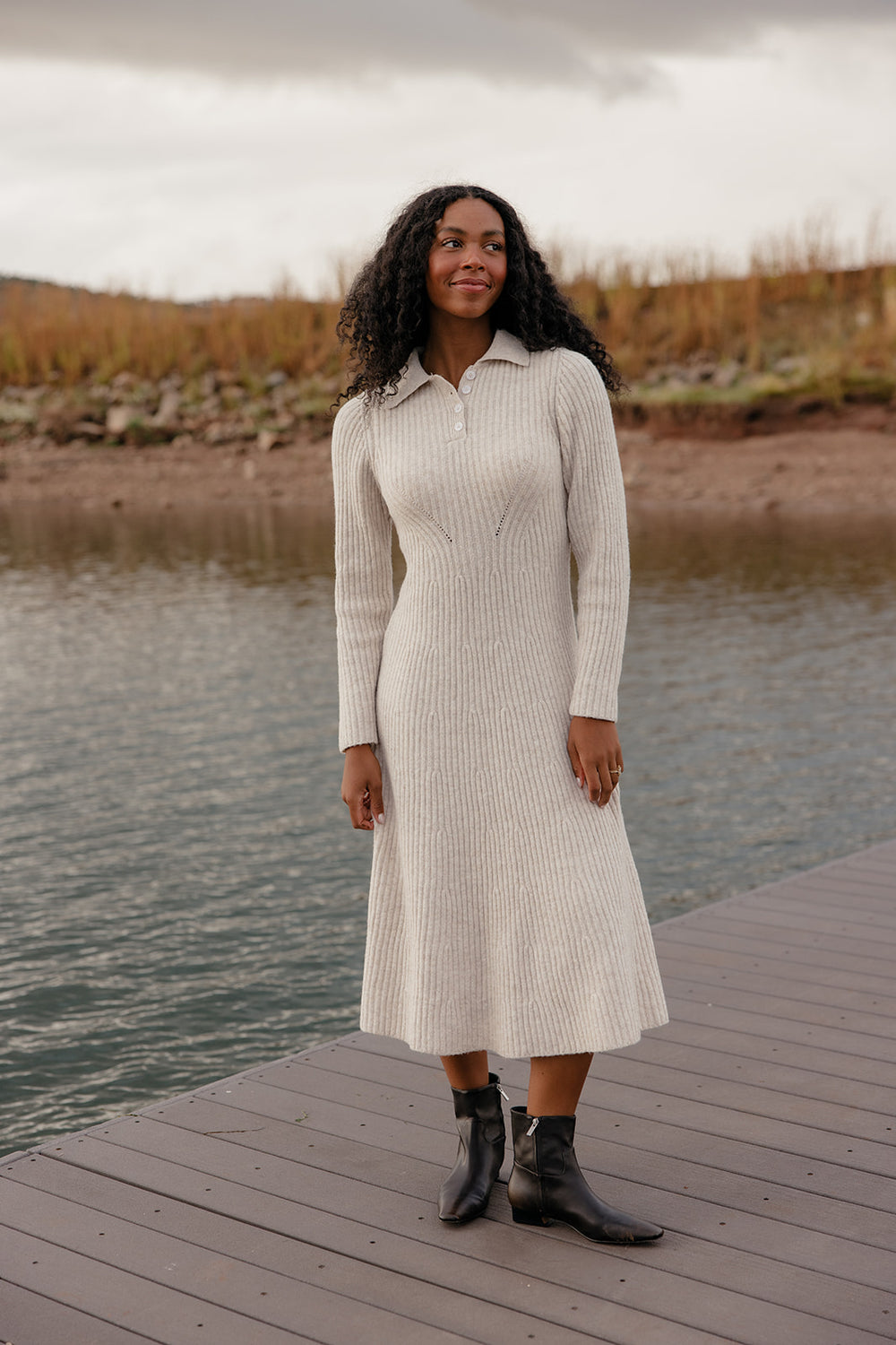 A modern take on cozy sophistication. With its ribbed texture and mock neck, this sweater dress feels as good as it looks β perfect for dinner parties or slow Sundays.