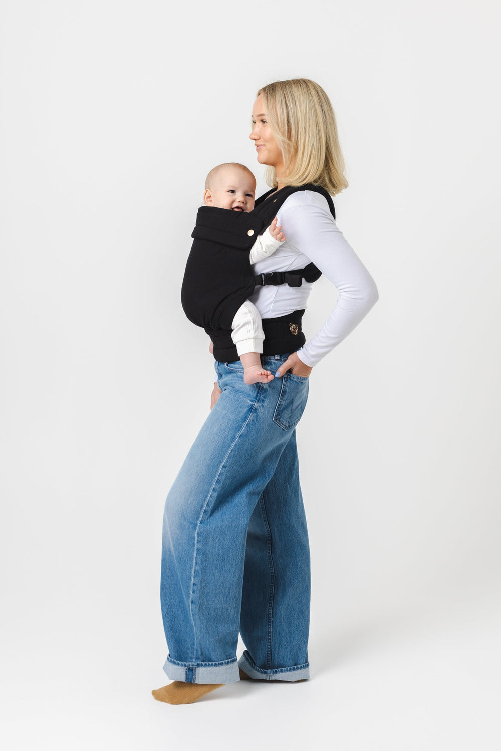 Our best selling carrier, now available in a gorgeous, textured, deep black. Sleek and versatile, this carrier has the same quality build and features as our houndstooth, and is perfect for anyone looking for a simple, sleek, and timeless look that goes with everything.